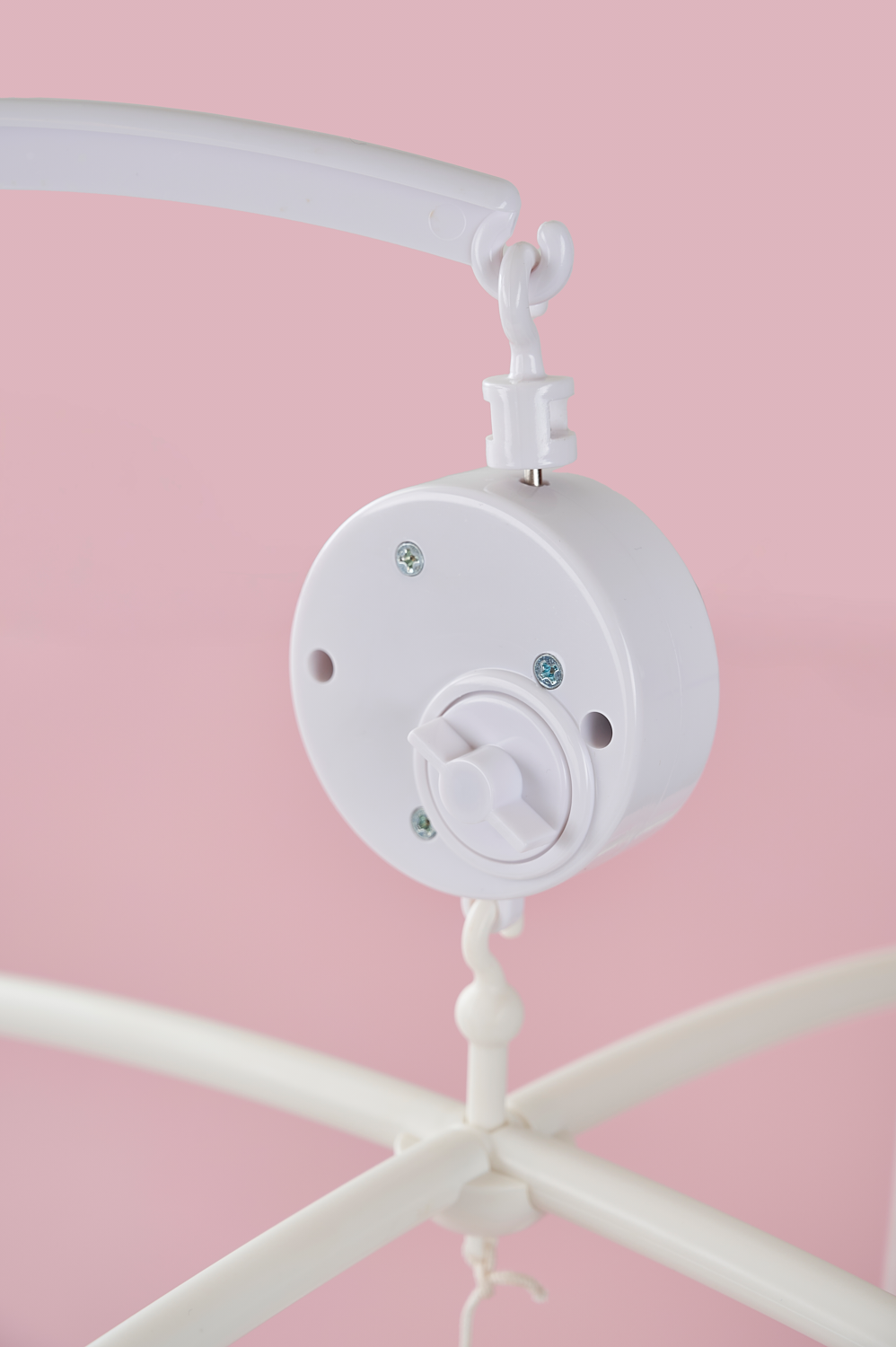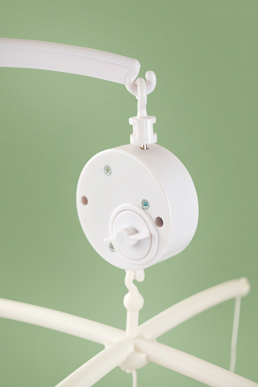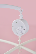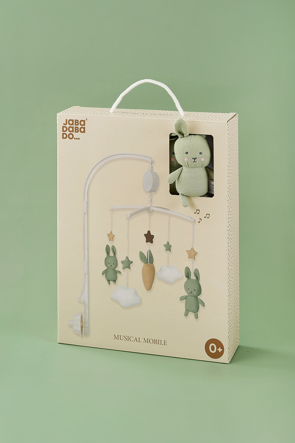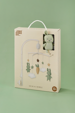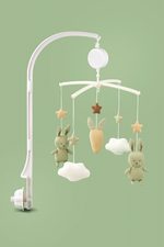 Sleep tight! Jabadabado's music mobile featuring clouds, stars, two bunnies in green and a carrot is perfect for hanging above the changing table or crib. The music box plays a calm lullaby (Brahms lullaby) and the figures slowly spin around when the mobile is turned on. The lullaby has a calming effect on the baby, and the moving figures entertain your baby while you change the diaper, for example. A white mobile arm that can be attached to the changing table or crib (max 40 mm) is included. The music mobile, with its melody and cute characters, will stimulate baby's sight and hearing during use.