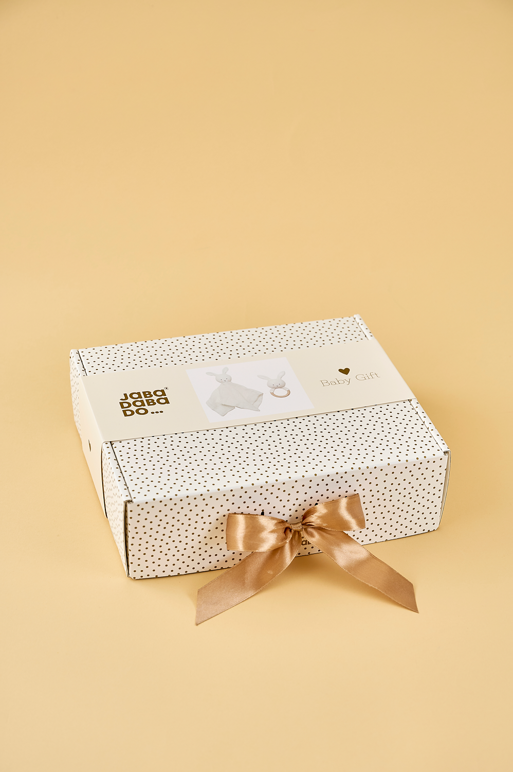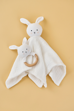 Baby Gift with cuddle.This baby gift is filled with adorable products that will become essentials in the family. Baby Cuddle .The cuddle in 100% muslin cotton is designed for cosy naps and bedtime snuggles and is the perfect companion for warm and tender moments. Baby wood rattle.The cute textile rattle with a handle in wood will stimulate the baby senses and is a perfect toy to use in a baby's developmental journey.
