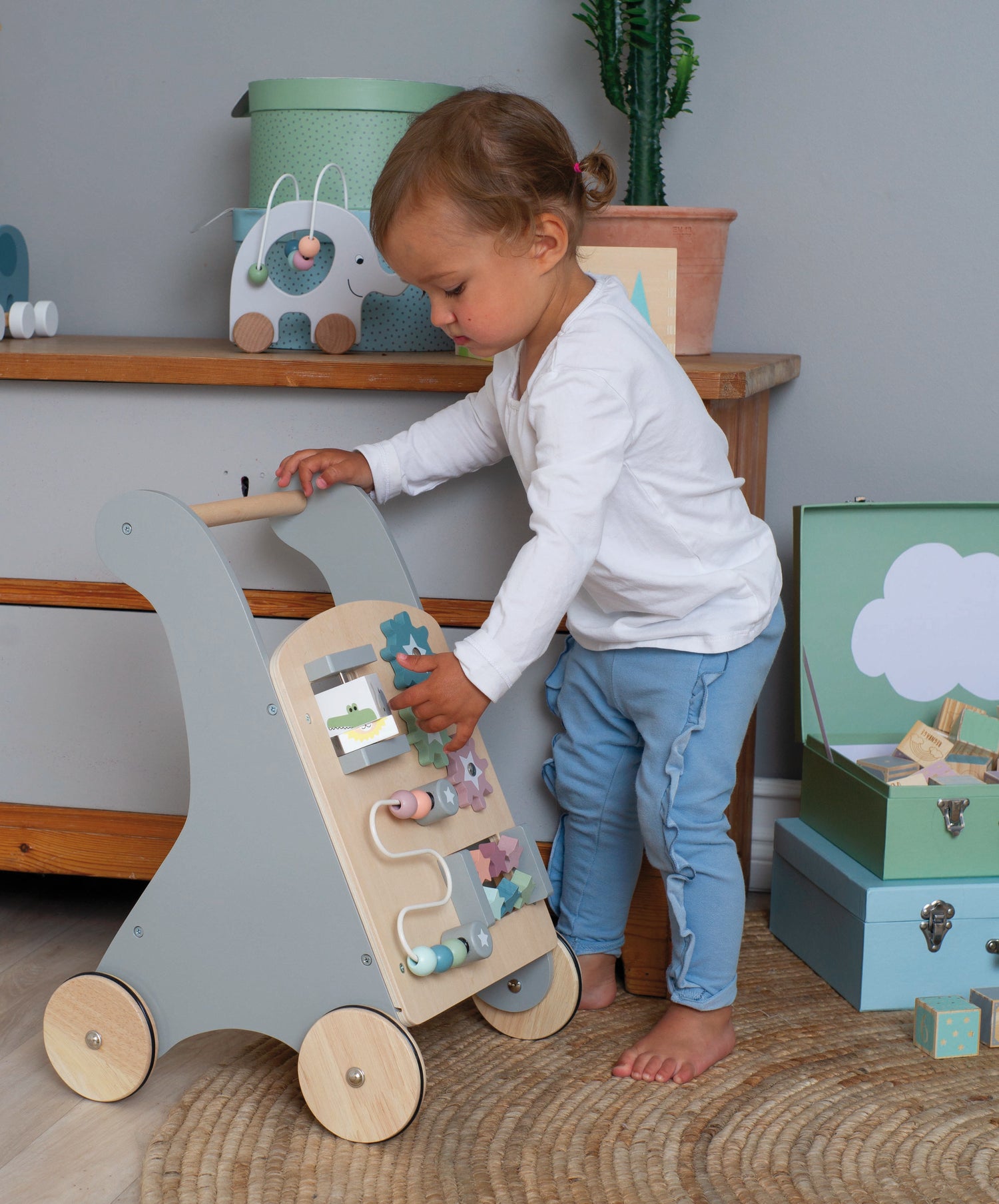 The perfect companion for taking their very first steps! Our new activity stroller comes in a nice earthy color and is ready to help your little one when it's time to start walking. There are also fun activities that will stimulate the child for a long time and on the back of the stroller there is space and room to store all the child's favorite toys. Made from FSC™ certified wood (FSC™C194598).
