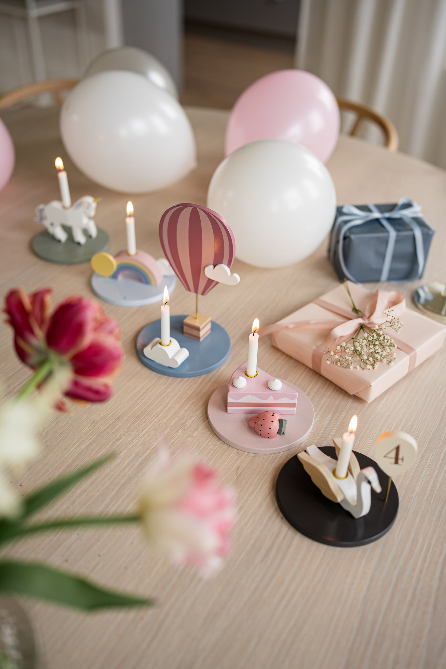 Birthday train with locomotive and 7 wagons, all decorated invidividually. Makes an excellent festive detail on the table at parties and is a gift guaranteed to be a success. A number between 0-9 can be mounted on the last wagon. The numbers are included. Make this train into your new tradition for every party or celebration.