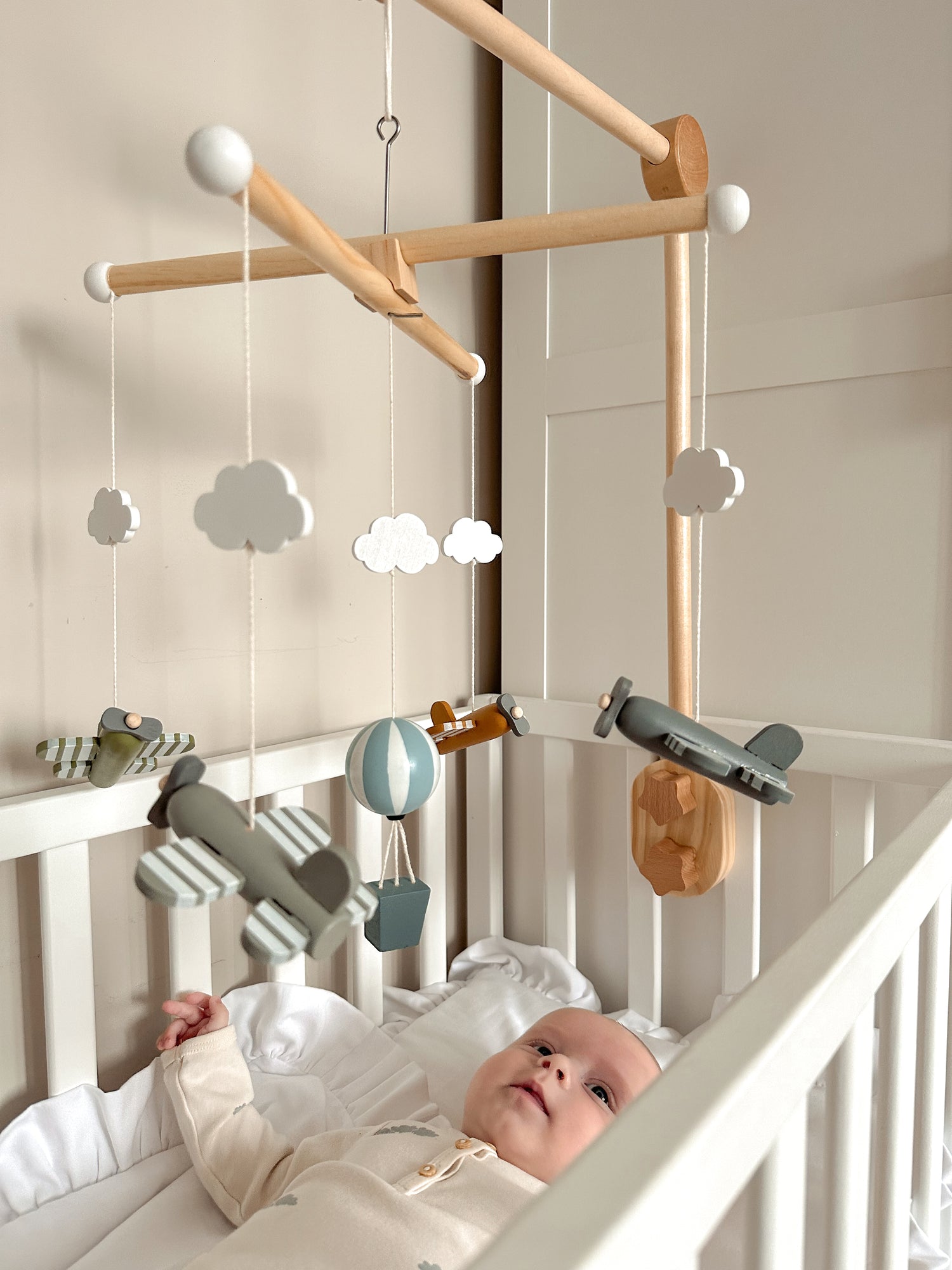 Cute wooden cot mobile for hanging over the bed or changing table in the children's room. The mobile features cute airplandes in lovely colours. The mobile's colours and patterns help stimulate the child's senses and movements during its first months. We have different mobile arms in wood for hanging up the mobile and these can be bought separately. To prevent possible injury, remove this toy when the child starts trying to push up in a crawling position. Keep out of baby's reach.