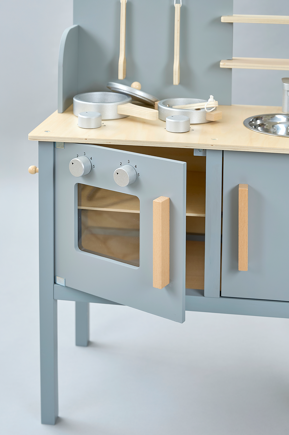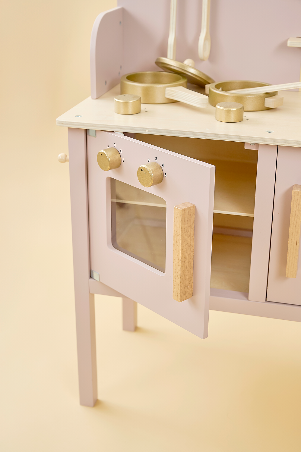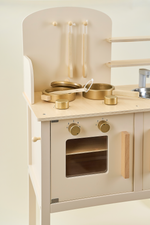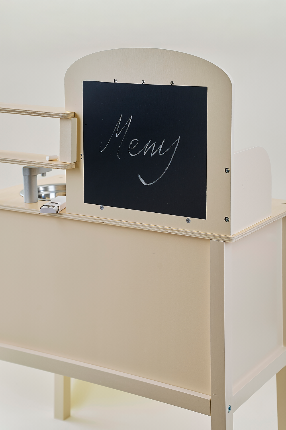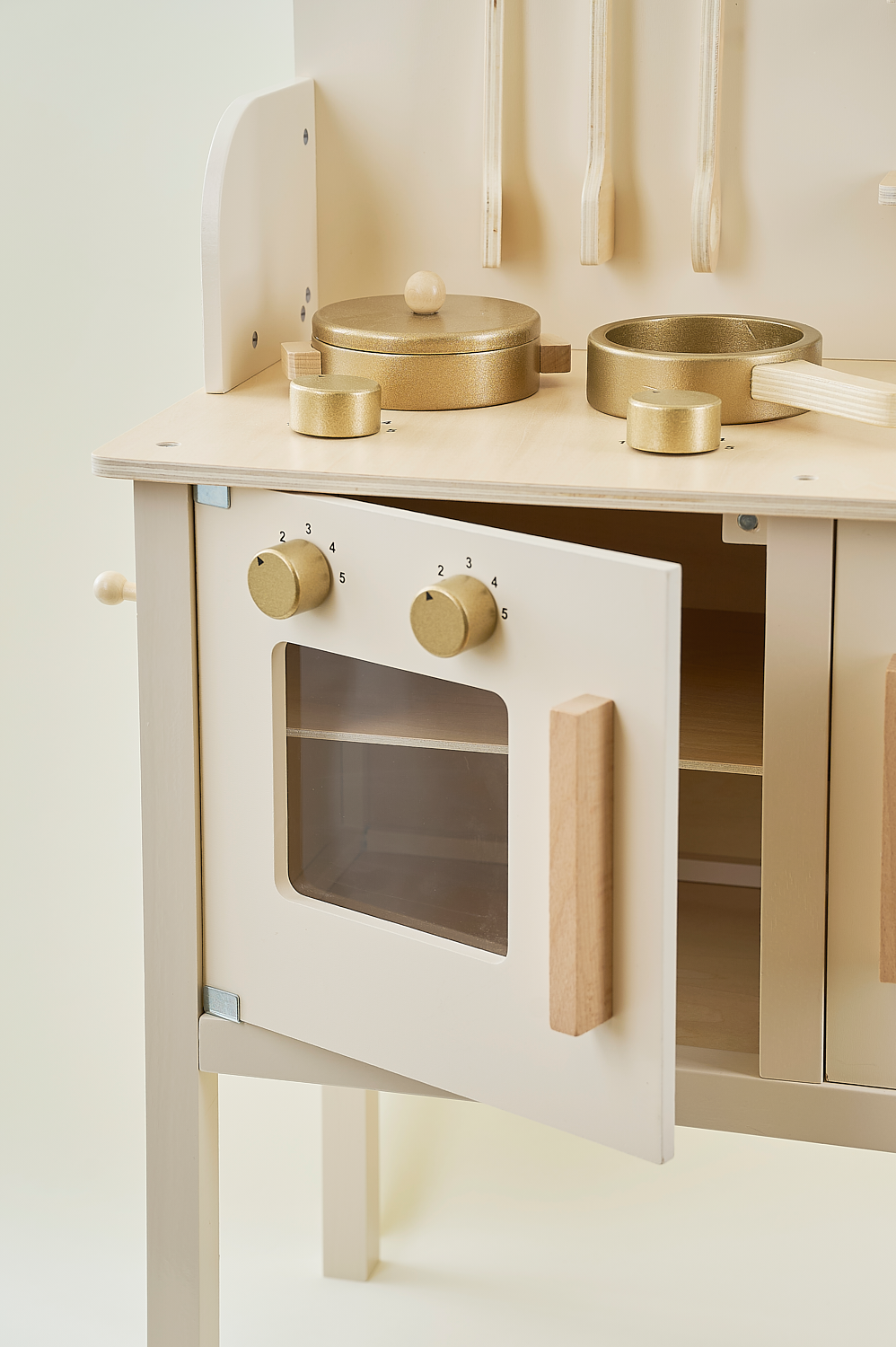 A wonderful children's kitchen for all food-loving children. With this lovely toy kitchen in cream, you will quickly become a real master chef. The kitchen contains lots of fun details, such as a sink, hob, oven, as well as a pot, frying pan and three kitchen utensils. Let your imagination run wild and create amazing dishes for the whole family. There is a chalkboard on the back of the stove so you can write what's for dinner. The kitchen is equipped with a hob, oven, sink, storage cabinets and two storage shelves with plenty of space for all kitchen accessories. The doors can be opened and on the hob there are 2 hotplates with associated screwable buttons so you can regulate the heat. When you're done in the kitchen, you can wash the dishes in the sink. There are hooks on the wall to hang your kitchen utensils and two nice pots are included. Bon appétit!