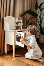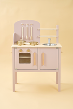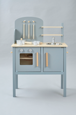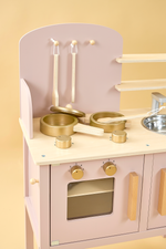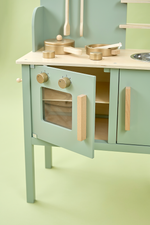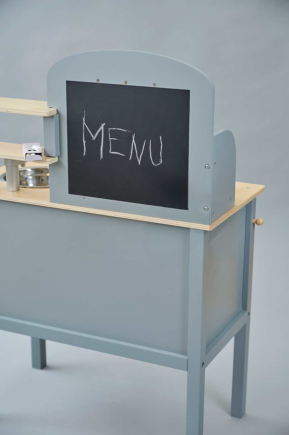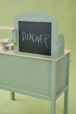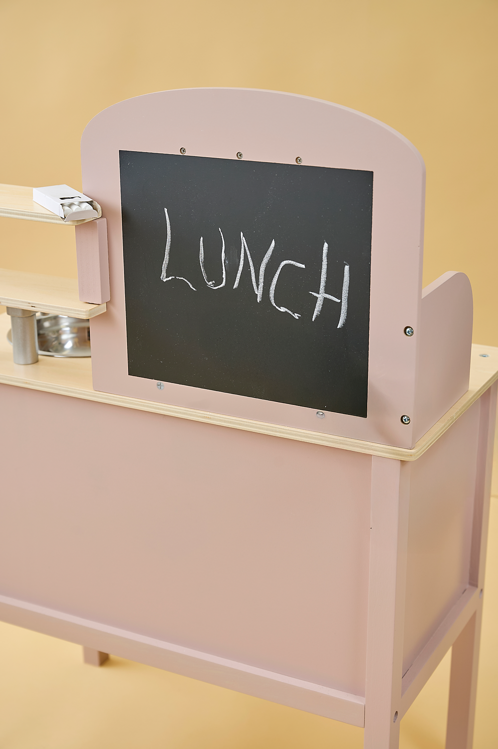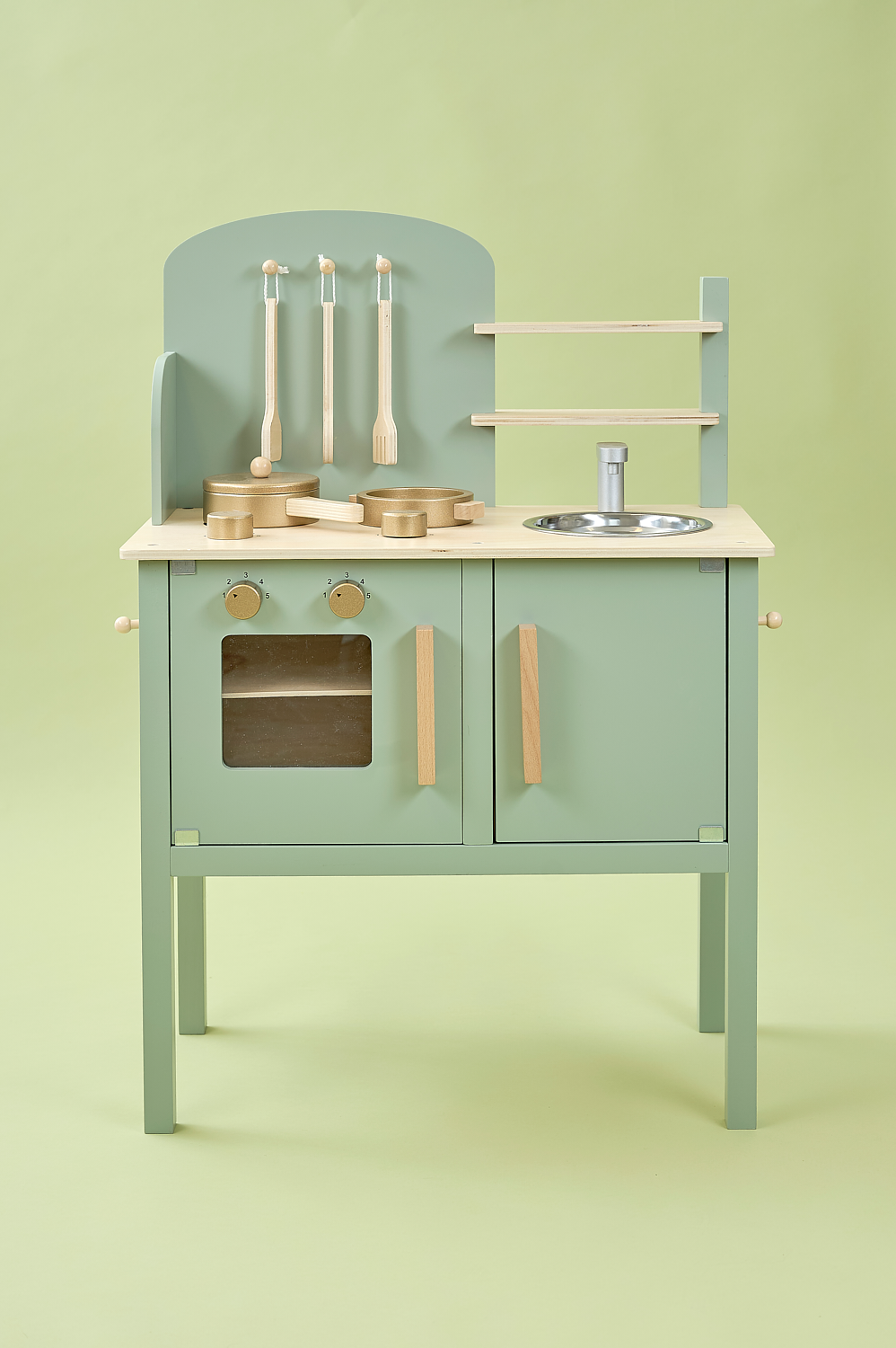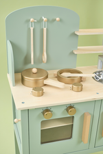 A wonderful children's kitchen for all food-loving children. With this lovely toy kitchen in cream, you will quickly become a real master chef. The kitchen contains lots of fun details, such as a sink, hob, oven, as well as a pot, frying pan and three kitchen utensils. Let your imagination run wild and create amazing dishes for the whole family. There is a chalkboard on the back of the stove so you can write what's for dinner. The kitchen is equipped with a hob, oven, sink, storage cabinets and two storage shelves with plenty of space for all kitchen accessories. The doors can be opened and on the hob there are 2 hotplates with associated screwable buttons so you can regulate the heat. When you're done in the kitchen, you can wash the dishes in the sink. There are hooks on the wall to hang your kitchen utensils and two nice pots are included. Bon appétit!