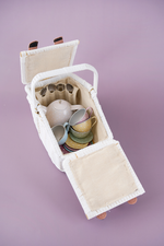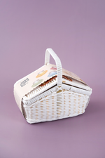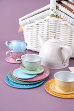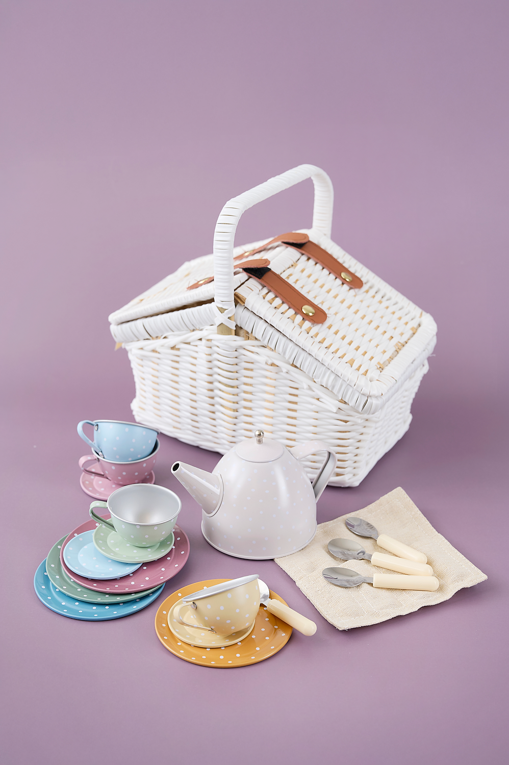 Picnic basket with a sweet little  tea service in tin. Complete with 18 parts, perfect for picnics or tea with friends in the children's room and outdoors. Show off and invite all the Teddy bears for tea and cakes.Lovely picnic basket with everything you need for tea time. The tea service contains a teapot, 4 cups, 4 saucers, 4 cake plates and 4 spoons, all finely packaged in a picnic basket. The basket is closed with a small button on the top.