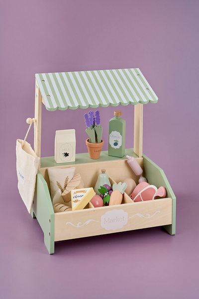Welcome to your very own market stall – everything for little merchants with big ideas! This wonderful wooden market stall is the perfect accessory for children who love to play store and sell everything from fresh vegetables to homemade bread. The set includes a lovely mix of goods: bread, vegetables, meat, cheese, milk, olive oil, and lavender in a pot – all in beautiful pastel colors. Additionally, there’s a small fabric bag to pack customers' purchases. Here, children can practice shopping, selling, and pricing their goods. Perfect for imaginative play and developing social and mathematical skills! 1x fabric bag, 1x pot with lavender, 1x bread, 1x milk carton, 1x bottle of olive oil, 1x cheese, 1x carrot, 1x onion, 1x tomato, 1x bag of flour, 1x egg, 1x grapes, 1x pear, 1x sausage, 1x meat, 1x fish, 1x brie cheese, 1x croissant.