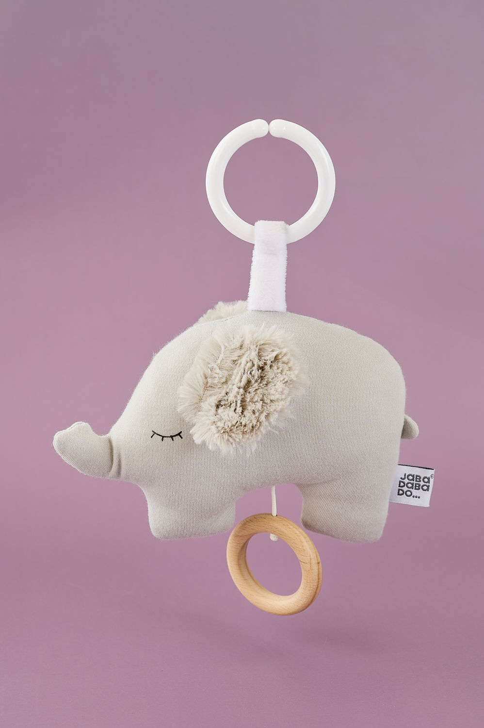 Cute musical box shaped lika an elephant to hang in the pram. Allow your child to sleep with a soothing melody. To activate the musical function, pull the hanging wooden ring and the toy will play a lullaby. The musical box is easy to attach and works almost everywhere. Made of 100% polyester and filling polyester fiber.
