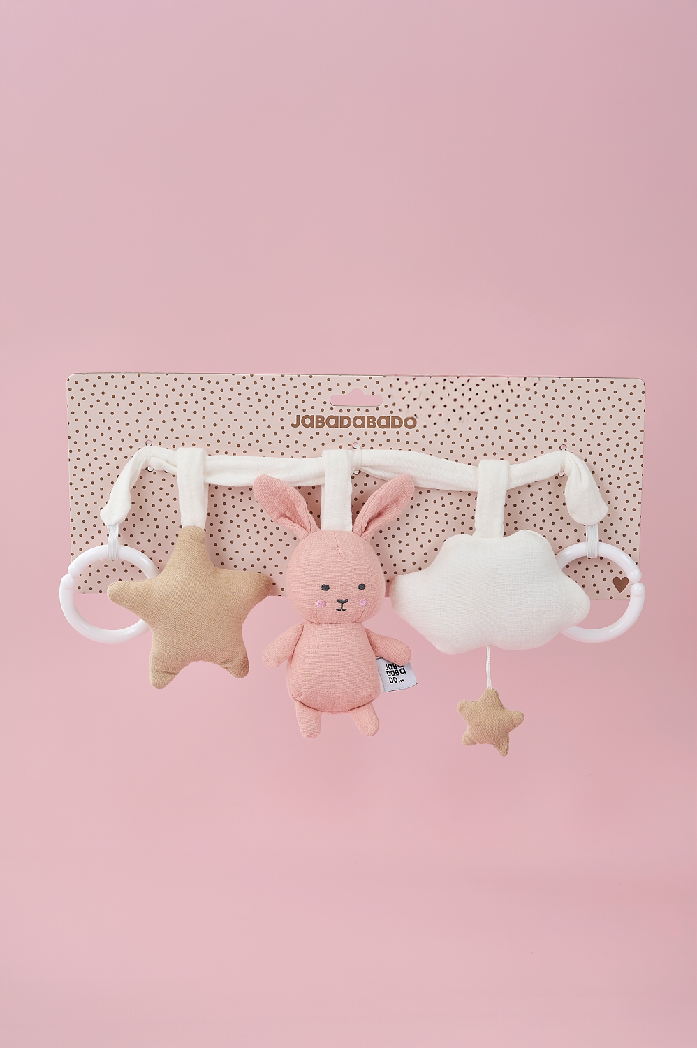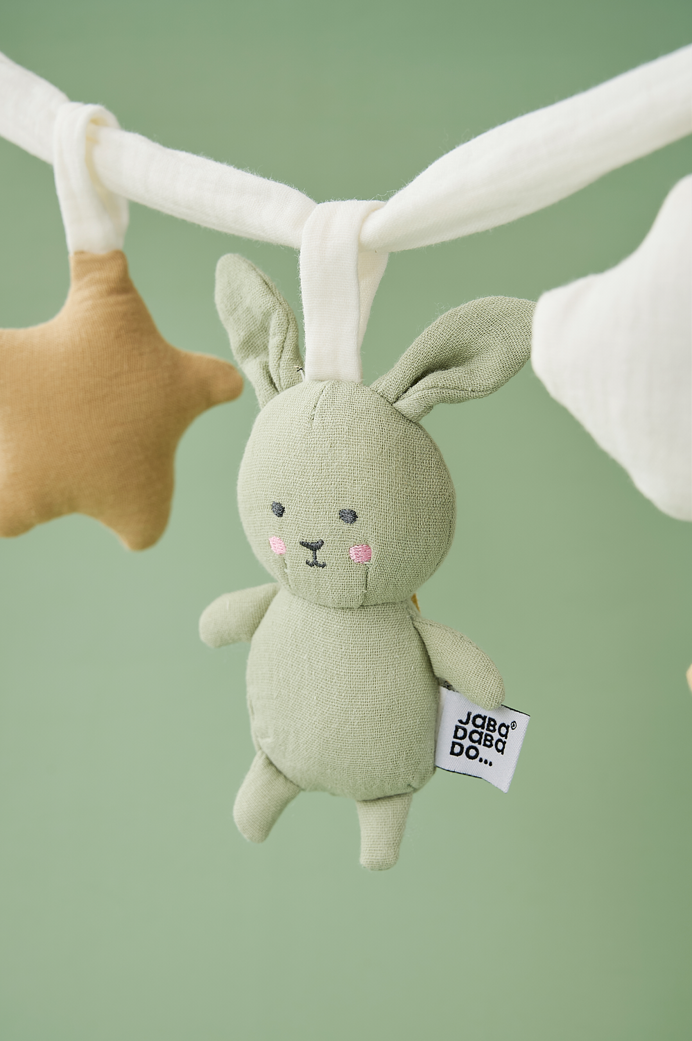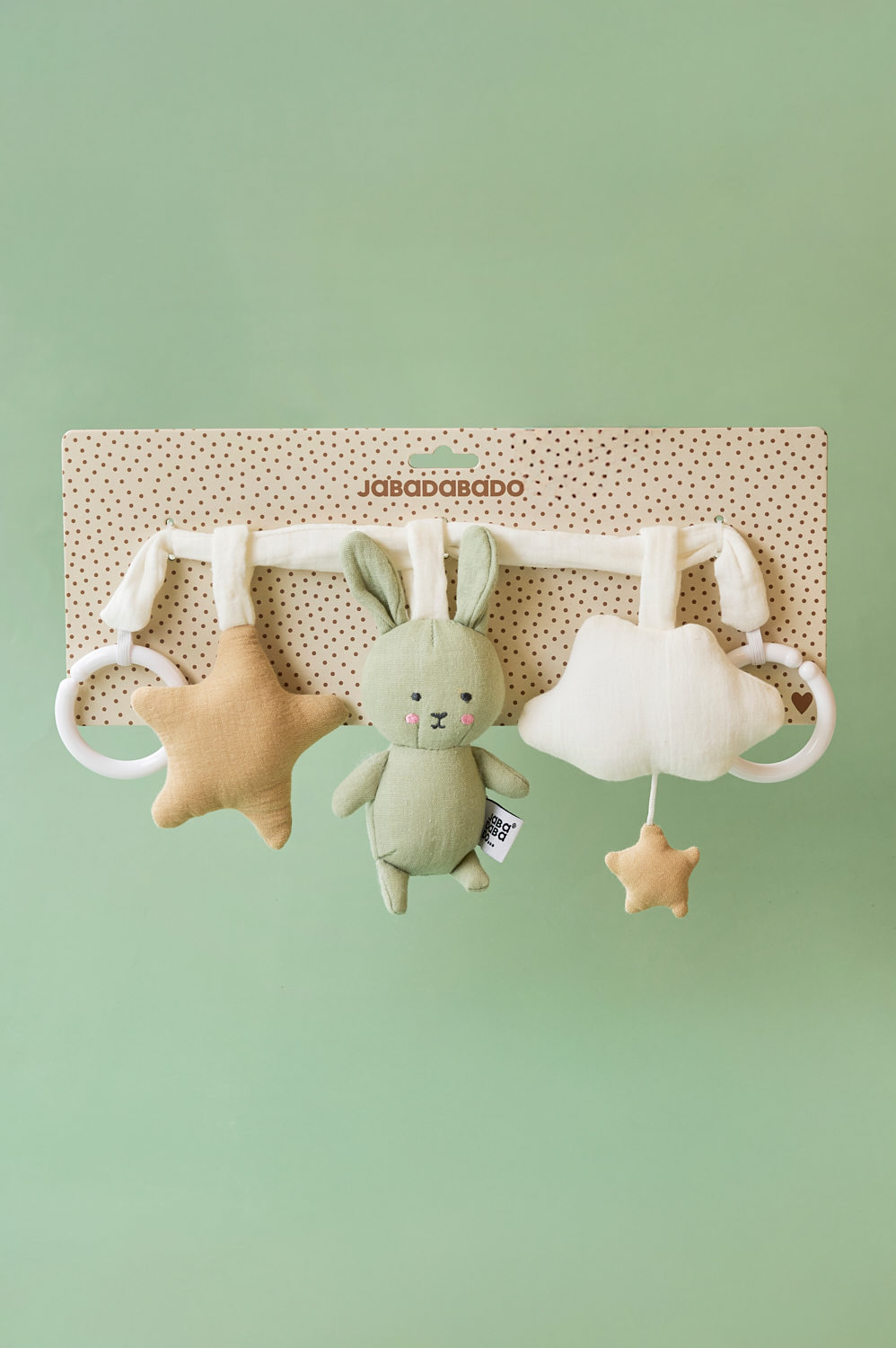 Jabadabado's pram pendant in the figures of Bunny, clouds and a star attaches to the pram to stimulate and entertain the child during pram walks. Also suitable for use in a car seat or in the baby seat in the car. Easily put in place with two elastic rings.