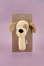 Adorable hand held rattle shaped like a puppy. Easy to grab and hold for the little baby's fingers. Made of the softest textile and with the cutest face, this rattle will be the baby's favourite toy. The gentle rattle noise is perfect sensory stimulation for infants. Made of softest muslin and filling polyester fiber.