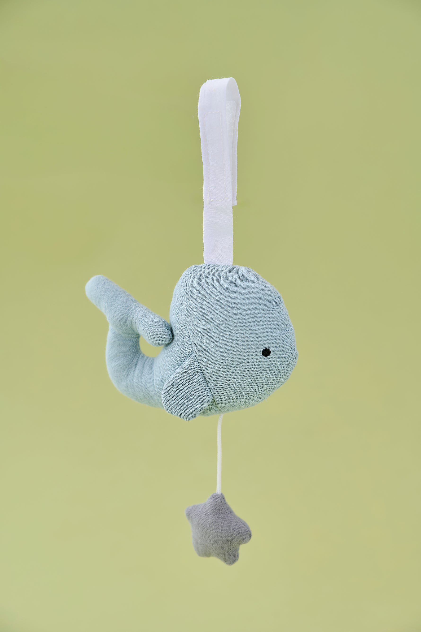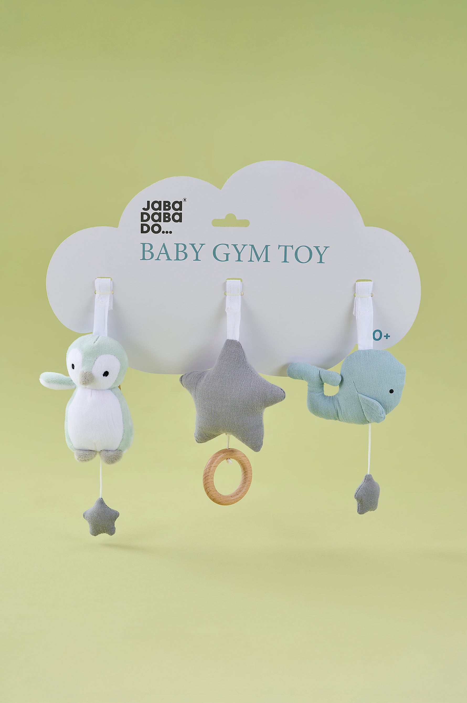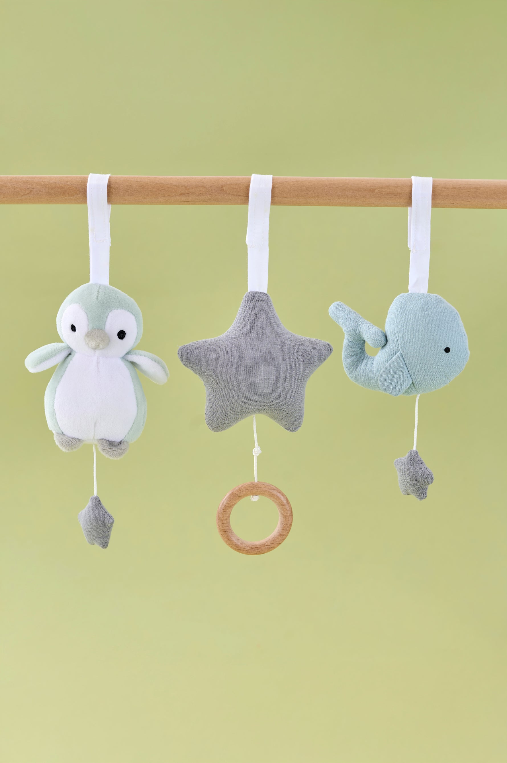 Adorable soft baby gym toys, including a star, a penguin and a whale. The star is playing a lullaby. The inviting shapes and colors will keep your baby entertained and stimulating development of visual and motor skills. Toys have long loops for easy attaching to a baby gym or most cribs and carriers for on-the-go fun. Wash by hand. Made of finest muslin and filling polyester fiber. Stimulating toys with interesting shapes and colours for the baby