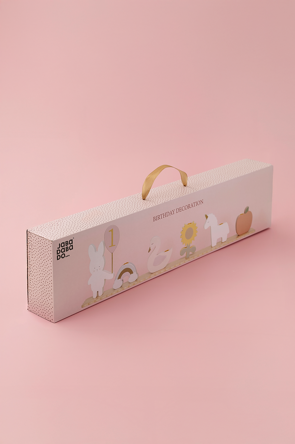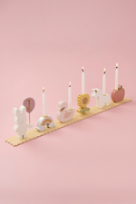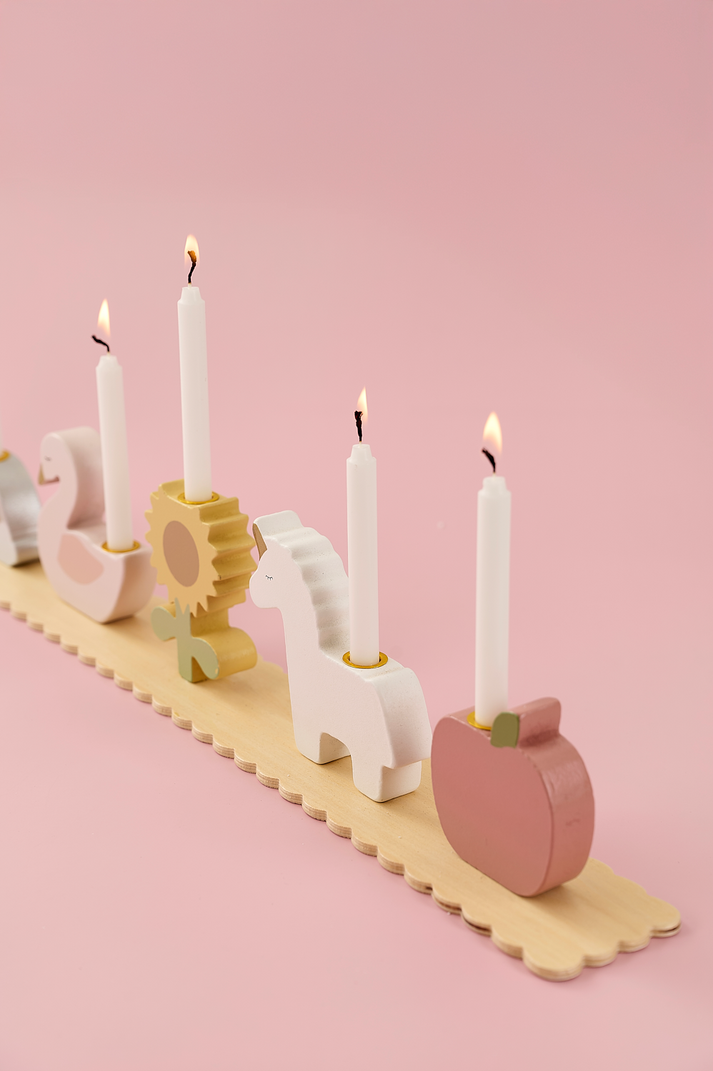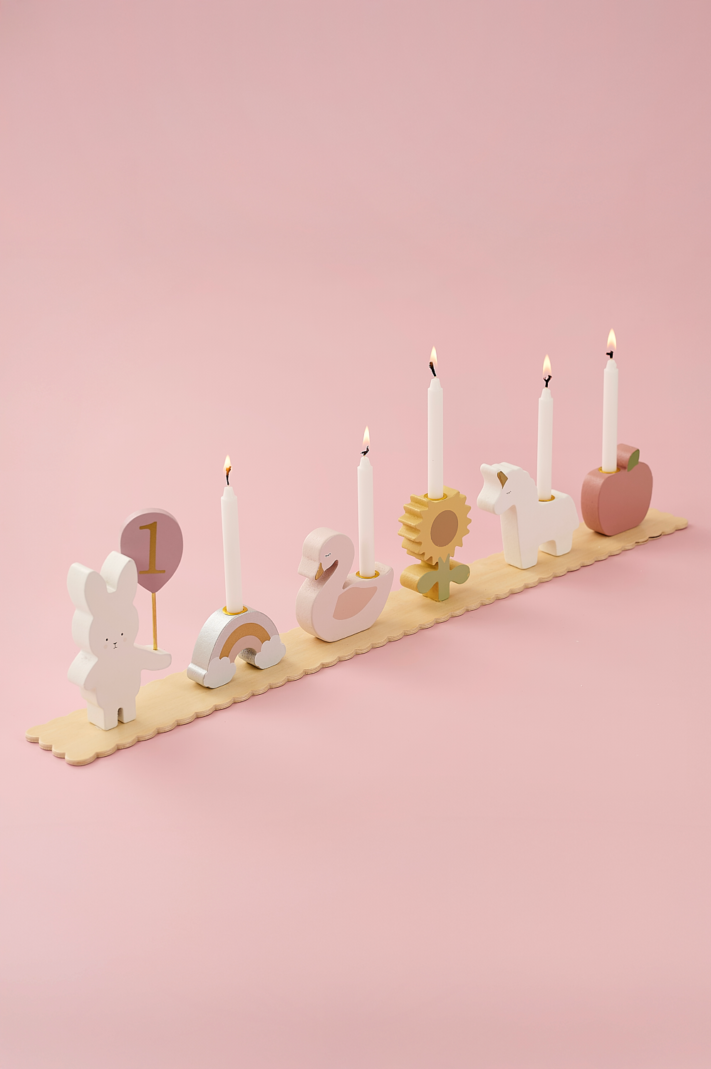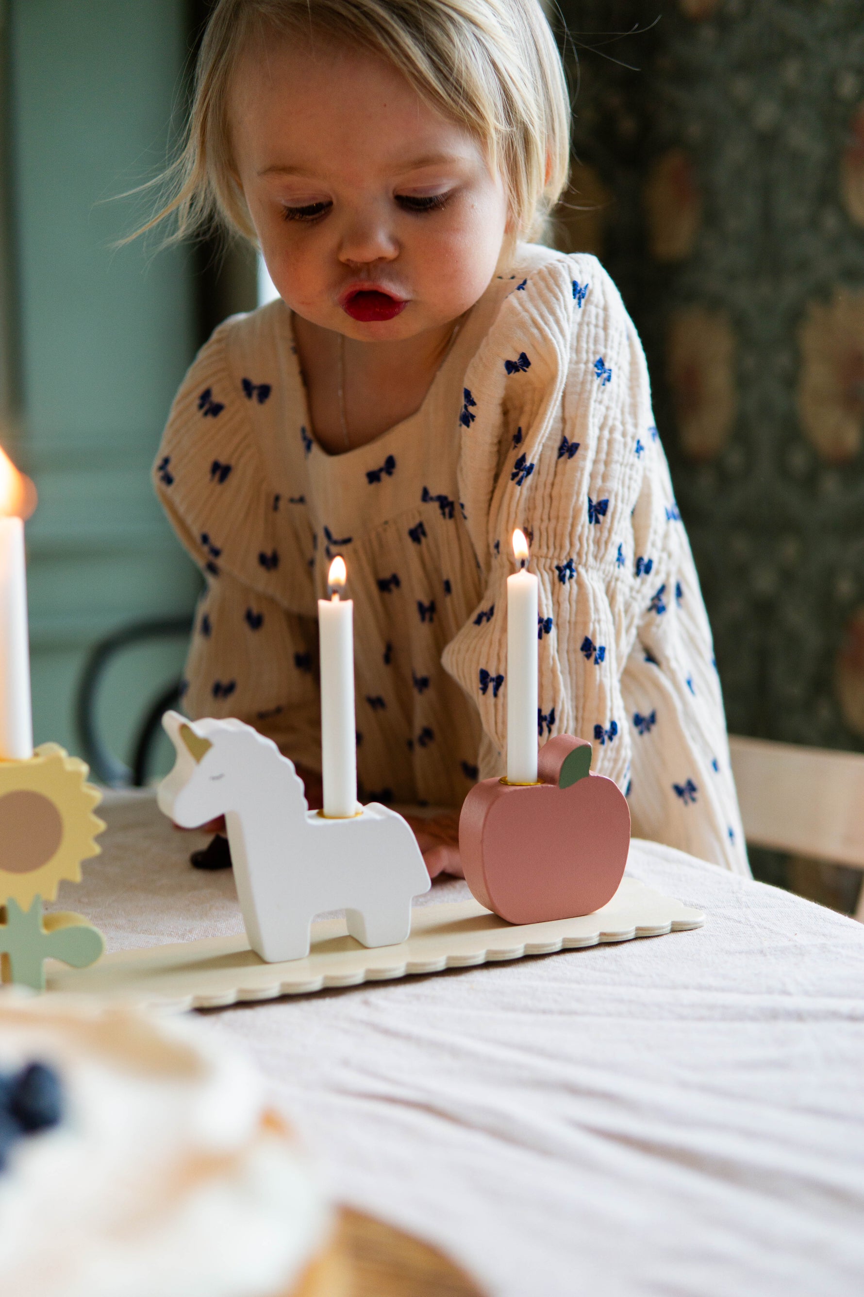 Create memorable birthday moments with these charming birthday trains! Each train is filled with cute figures – all ready to celebrate your little one. With soft, playful colors and beautiful wooden details, this birthday train is not just a decoration but also a beloved tradition that can be used year after year. Let the birthday train become a part of the family’s traditions and create magical moments as the figures are set up one by one before the party. With Bunny and friends, this birthday train will be a lovely centerpiece on the party table. 1x Bunny, 1x rainbow with candle holder, 1x swan with candle holder, 1x sunflower with candle holder, 1x unicorn with candle holder, 1x apple with candle holder.