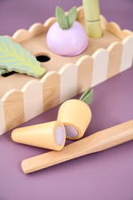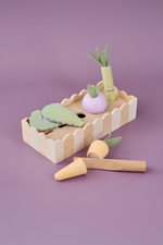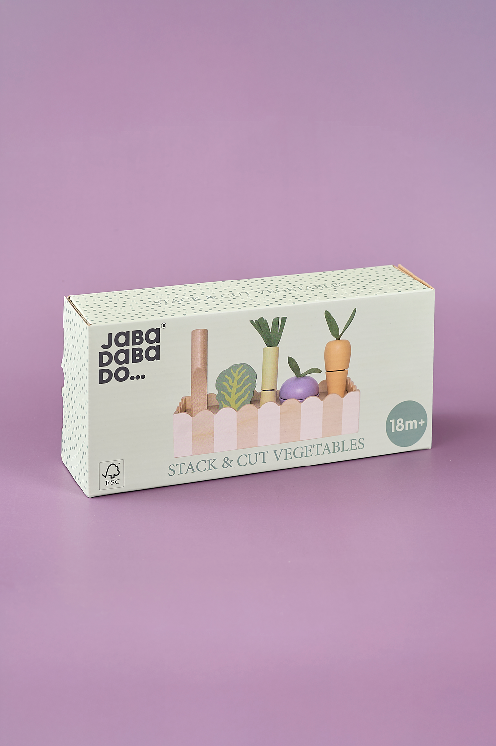 Slice and stack vegetables! With this playset, children can slice, stack, and create their own vegetable dishes. The set includes a carrot, leek, red cabbage, and lettuce – all made of wood and in beautiful, nature-inspired colors. The vegetables can be separated with Velcro and are perfect for little chefs who want to practice their motor skills and pretend to cook in the kitchen. A creative choice for playful learning! 1x stackable carrot, 1x stackable rutabaga, 1x stackable leek, 1x lettuce head, 1x wooden knife, 1x decorative wooden box to store the vegetables.