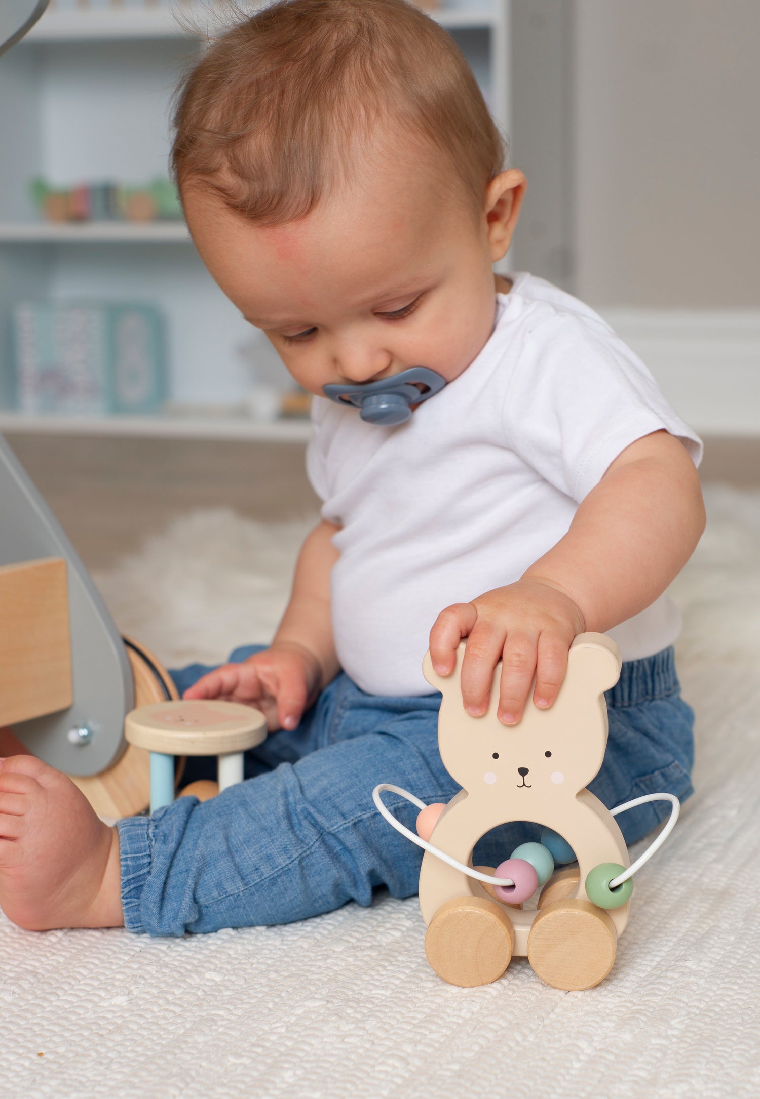 Jabadabado's Teddy rolling animal is made of wood and specially designed for the smallest children. The teddy bear in nature is designed to be easy to grip and fits perfectly in small children's hands. On its wheels, it rolls easily and smoothly across carpets and floors. It also has a ball frame with five colorful balls that can be moved around the teddy's body. As it rolls across the floor, it encourages your child to crawl, walk and explore their surroundings, while playing with the ball frame develops their motor skills. Perfect as a one-year anniversary or christening gift. Made from FSC™ certified wood (FSC™C194598).