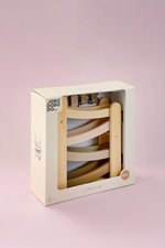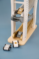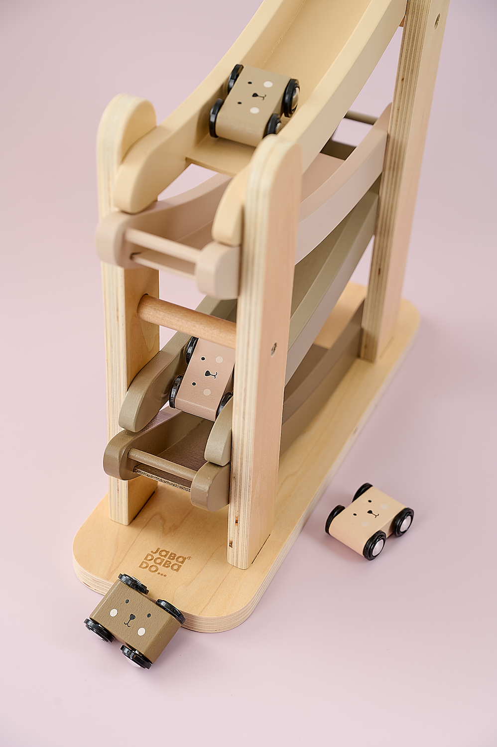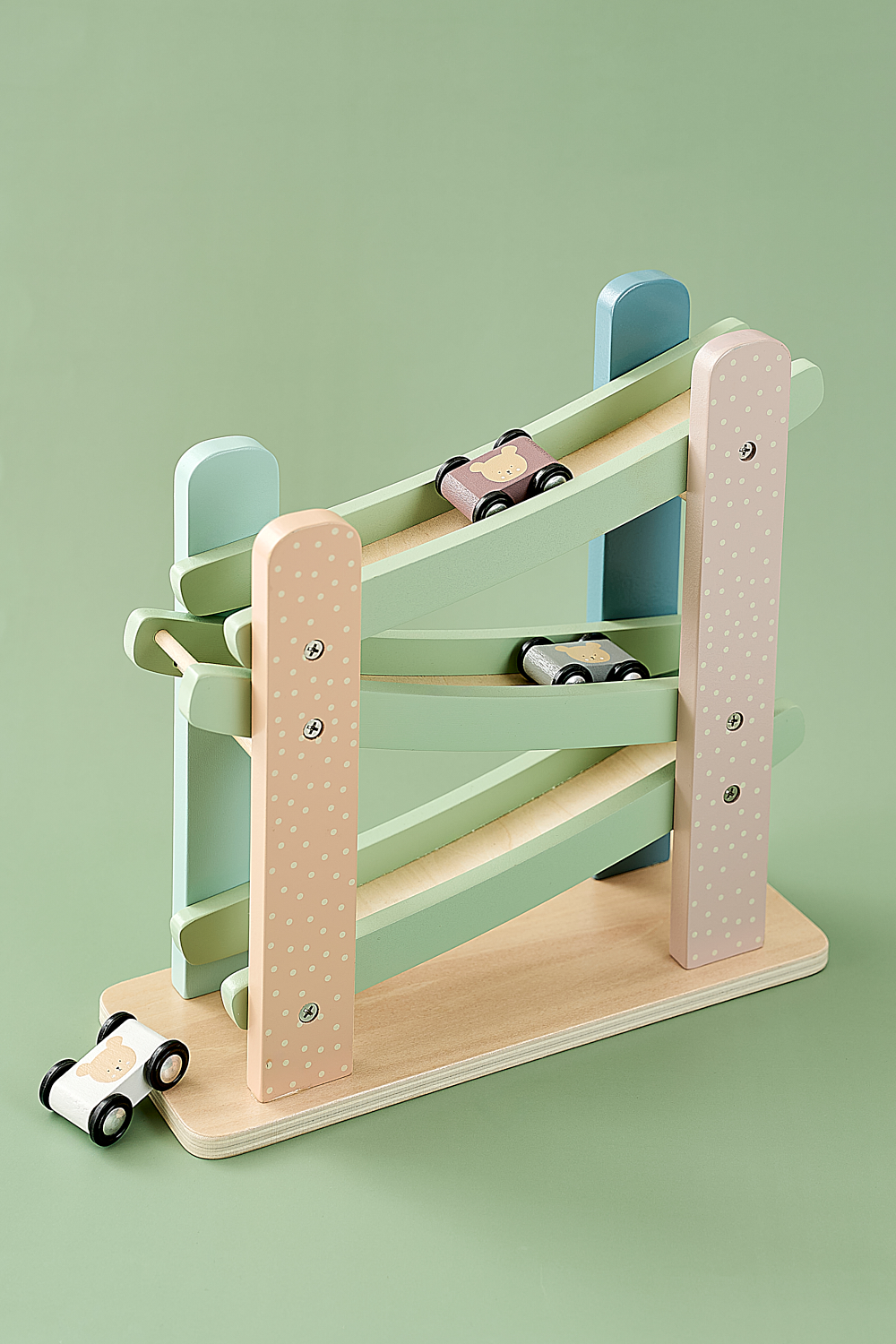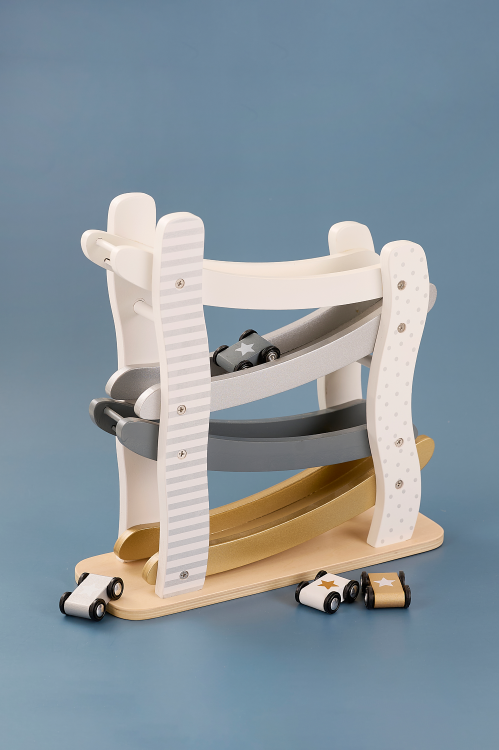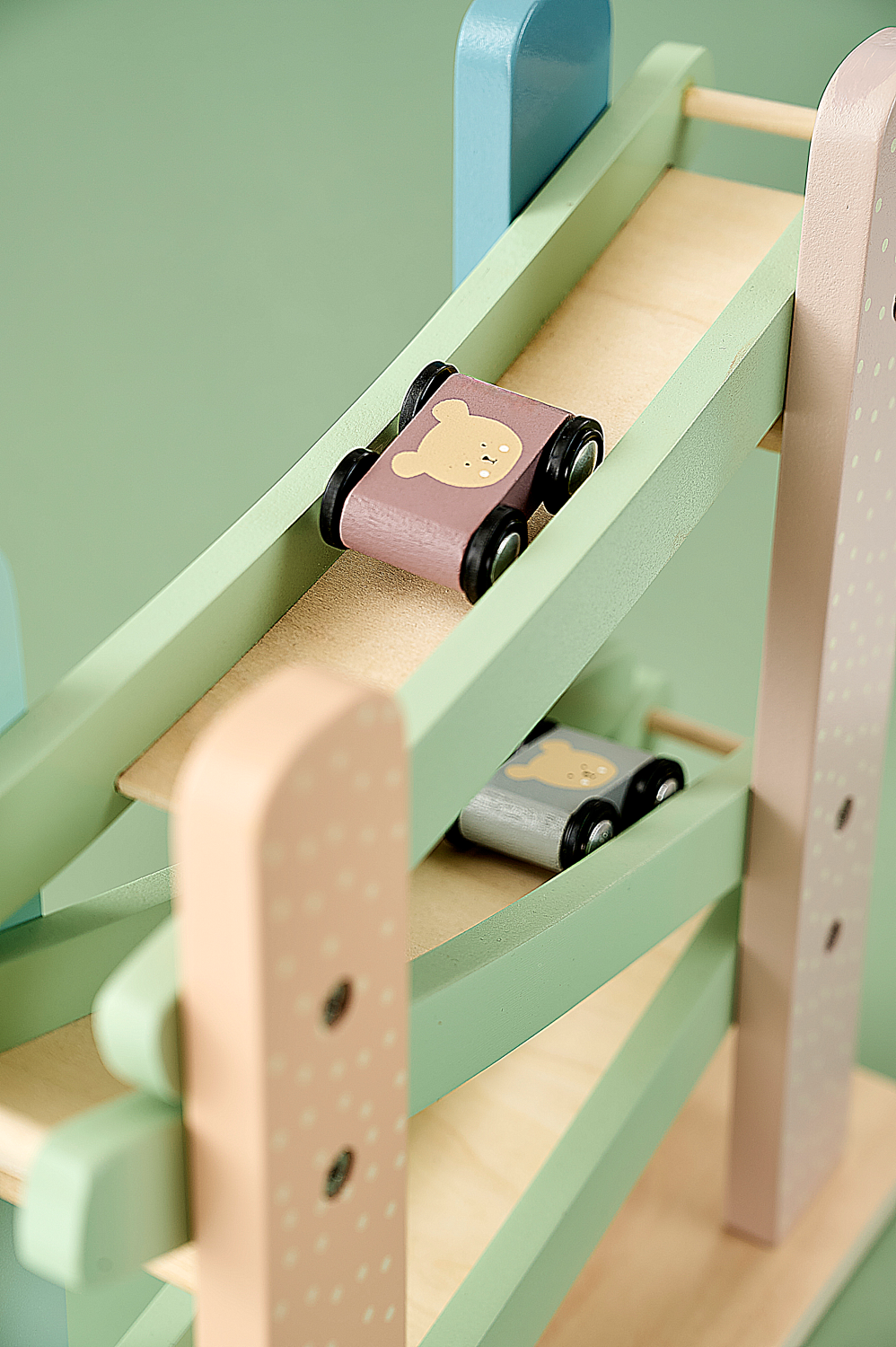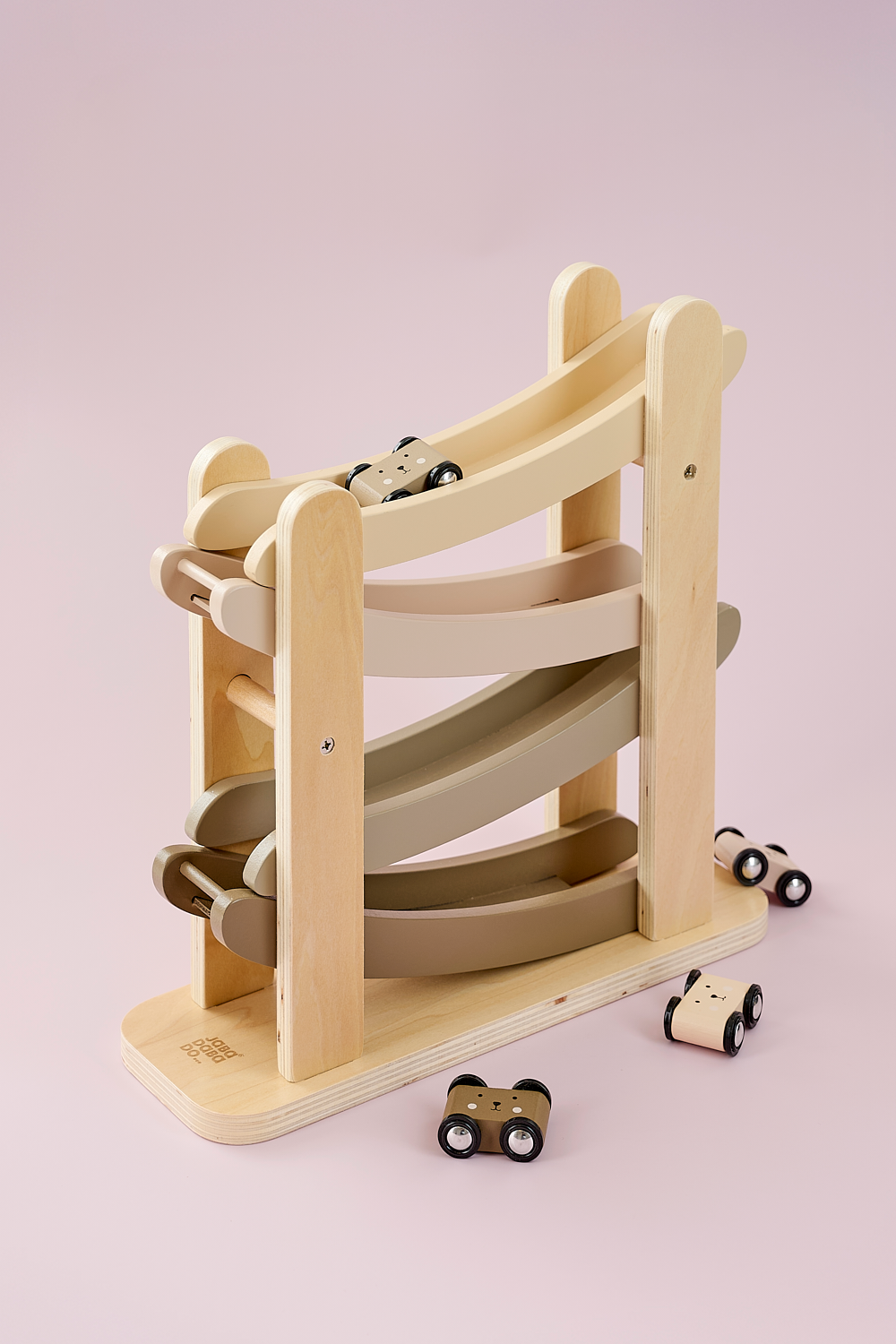 A creative and fun car track in natural colors for all car-crazy kids. Drop the cars at the top of the track and watch as they quickly travel all the way down. A stimulating and entertaining car track that will keep your child active for a long time. Compete with your friends and see which car comes down the fastest. A must for all little racers. The car track has four matching cars in different shades and colors. Made of FSC™ certified wood (FSC™C194598).