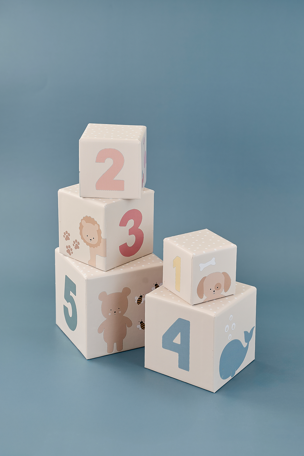 Stacking Cubes. This entertaining stacking tower consists of cubes and guides the child in learning to balance objects to keep the tower upright. At the same time, children practice hand-eye coordination and are introduced to early math skills such as size, height, comparison, order and more.