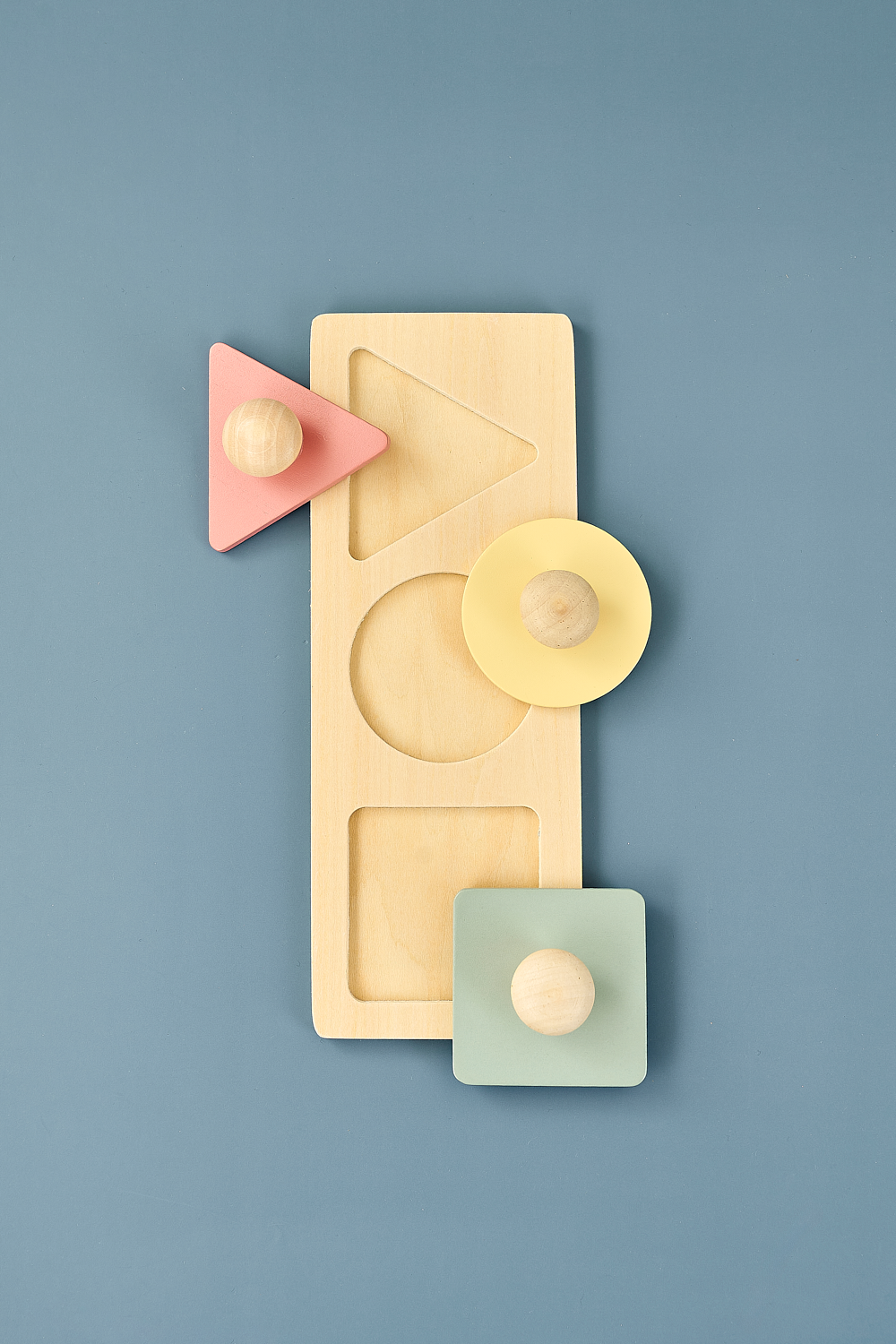 Shape Puzzle. The colourful geometric design helps children to recognize different shapes and colors more easily. The product not only promotes fine motor skills and matching skills but also trains hand-eye coordination and visual perception. The large wooden knobs are designed to be easy for small hands to grip.