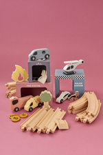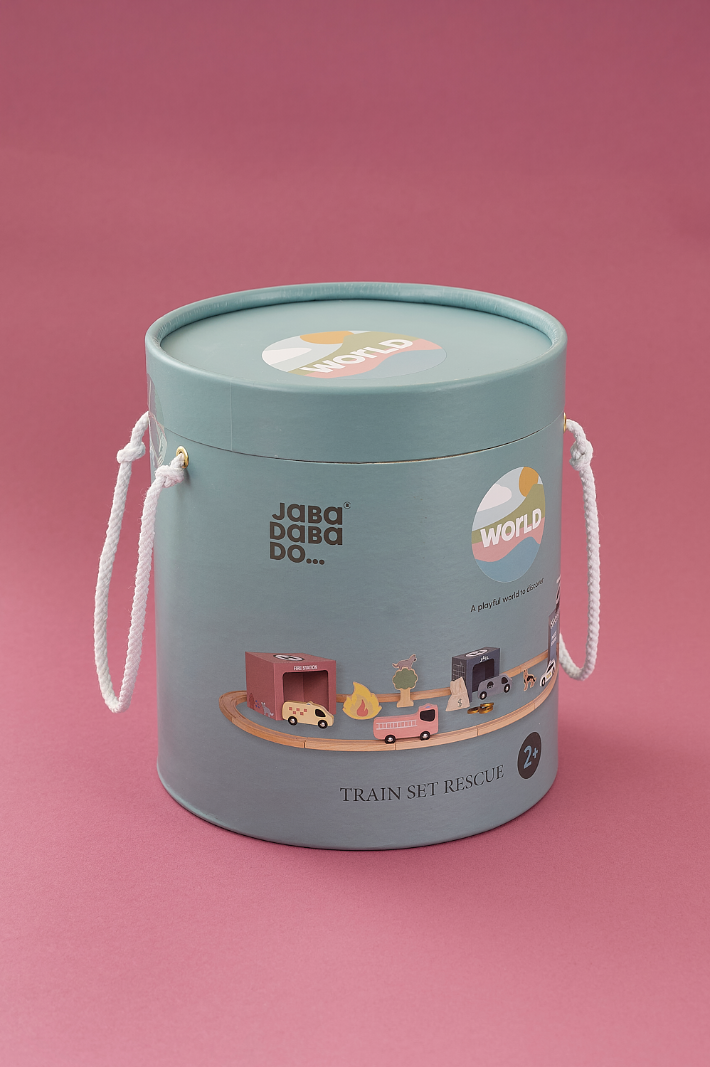 Time to fight the fire! Jabadabado's classic wooden train rail with rescue vehicles features both a police station, a fire station, and a prison. Build the rails together and place the three houses along the road, cars can drive through the police station. The police car and the helicopter search for the thieves that seem to have stolen the money! When the thieves are caught, you take them to the prison. When the hunt is over, land the helicopter safely on one of the three houses' helipad. Oh no, a cat seems to have climbed a tree and can’t come down. Hurry up and go there with the fire truck to help the cat down to the ground again. But the bad luck is not over, now a fire seems to have broken out. Toot toot, the fire engine is on its way to put it out. Phew, finally there seems to be peace and quiet in the city. Now the cars can calmly patrol along the rails, waiting for new adventures. The train rail encourages creative play and is guaranteed to keep the child occupied for hours. Can be combined with Jabadabado's garage as well as other train and car rails from both Jabadabado and other well-known brands on the market.Contains: