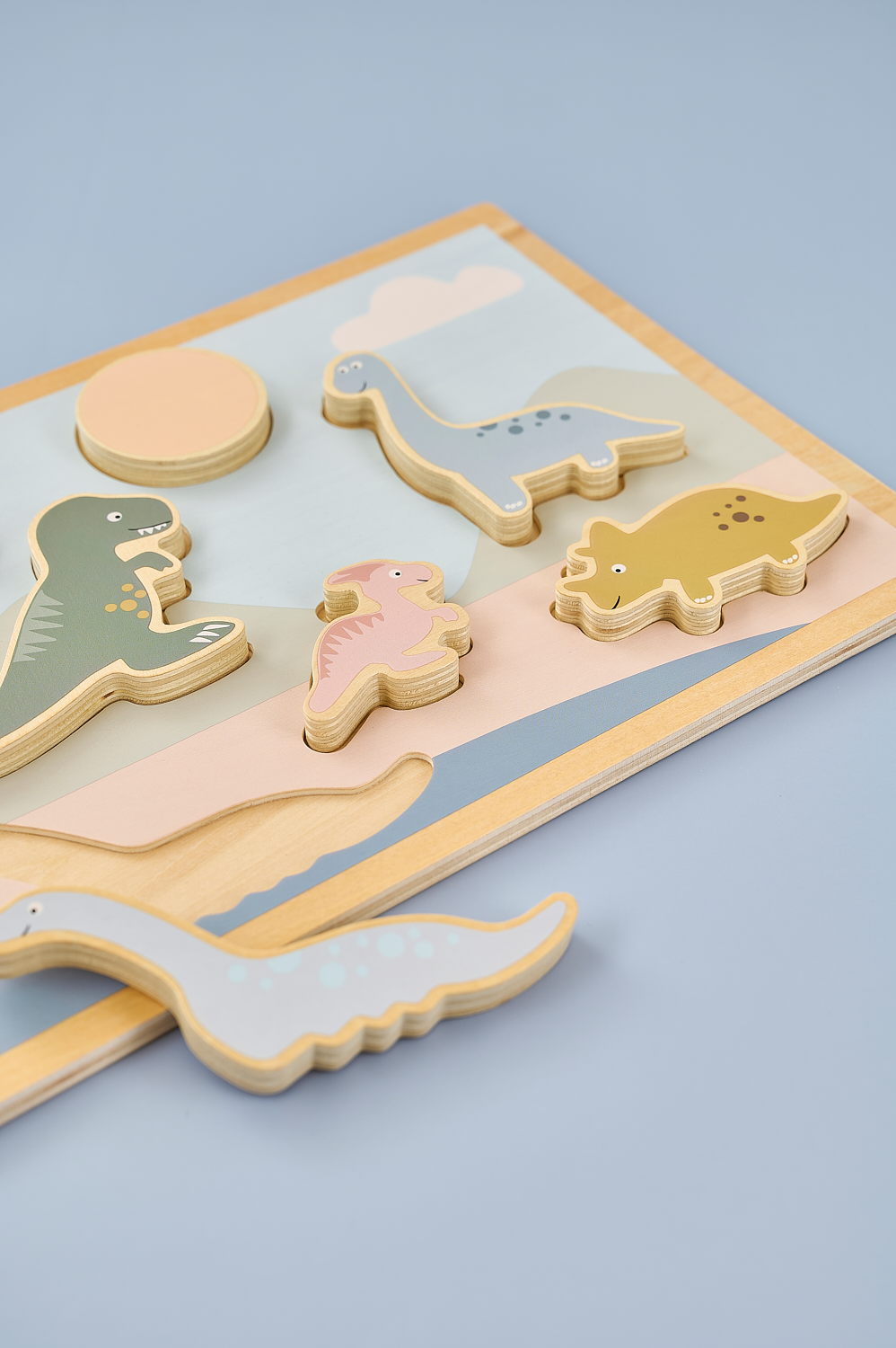 A fun, stimulating wooden dinosaur puzzle with seven different figures. The puzzle pieces are extra grippy to fit small hands. The figures are also fun to play with and help to stimulate the child for a long time as it trains fine motor skills and eye-hand motor skills. A perfect puzzle with different dinosaurs where the child can practice how a dinosaur sounds.