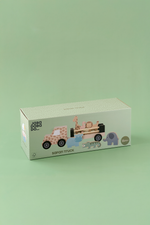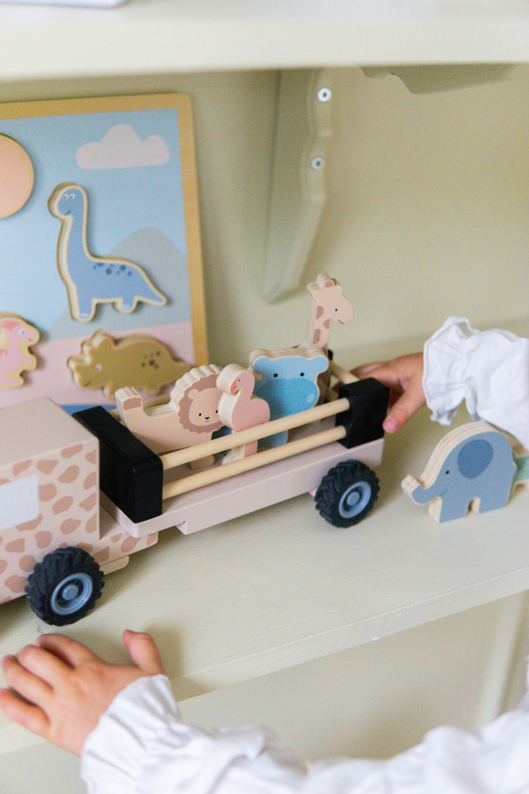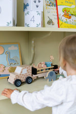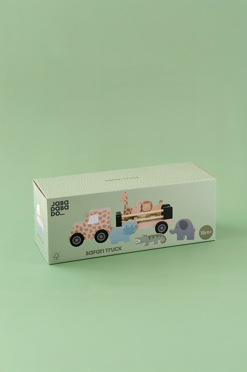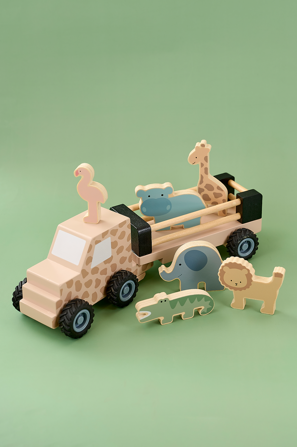 Embark on an exciting safari with the Truck Safari! This colorful and detailed toy trailer is perfect for little animal lovers who want to explore the wild animals of the savanna. The set includes a truck with animal patterns and several cute wooden figures, such as a lion, giraffe, elephant, and hippopotamus. Play and learn at the same time – children can practice the names, sounds, and roles of animals in nature. The upgraded design with rubber wheels provides a smoother ride and extra durability. A timeless toy that guarantees many hours of imaginative play! Made from FSC™-certified wood (FSC™C194598).