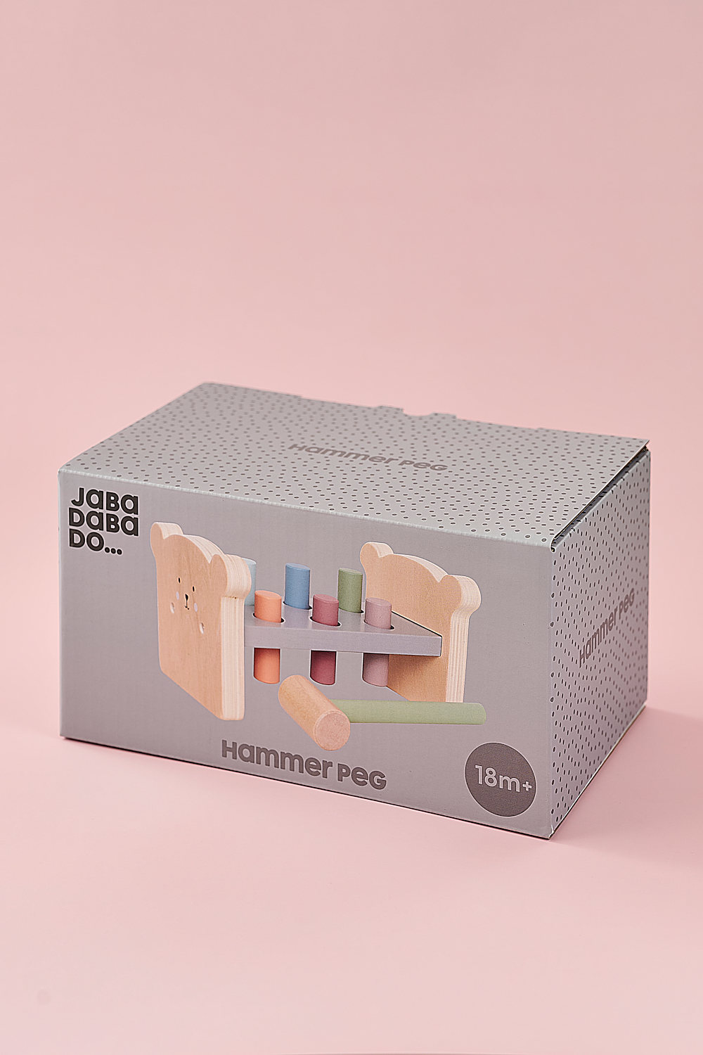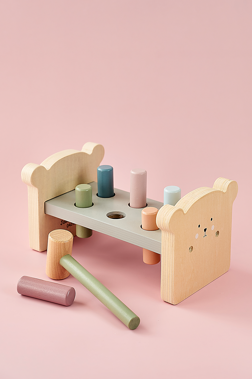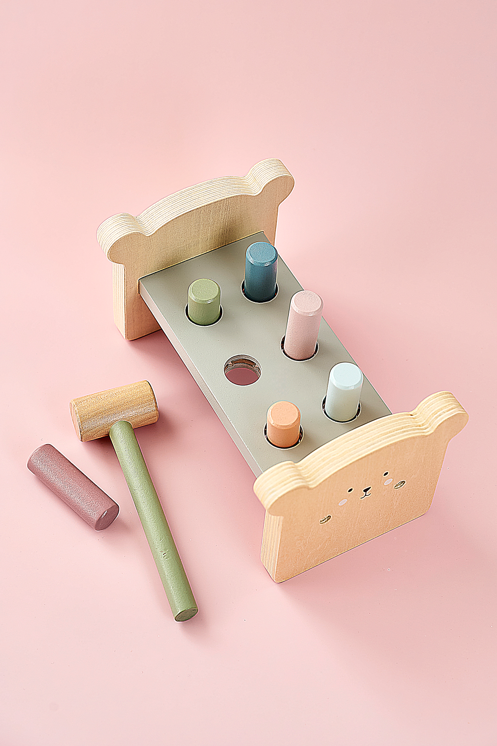 Classic pounding bench made entirely of wood in beautiful colours. Your child can exercise their coordination and best of all it does not matter how hard they hit! Pounding bench in lovely colours with a cute Teddy on the side. The pounding bench is a fun toy that helps your child to exercise their hand and eye coordination. Pound all the staves in with the hammer and then when all of them are completely down, just turn it upside down and start over.
