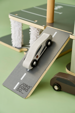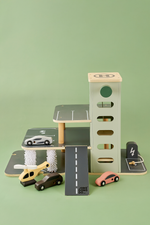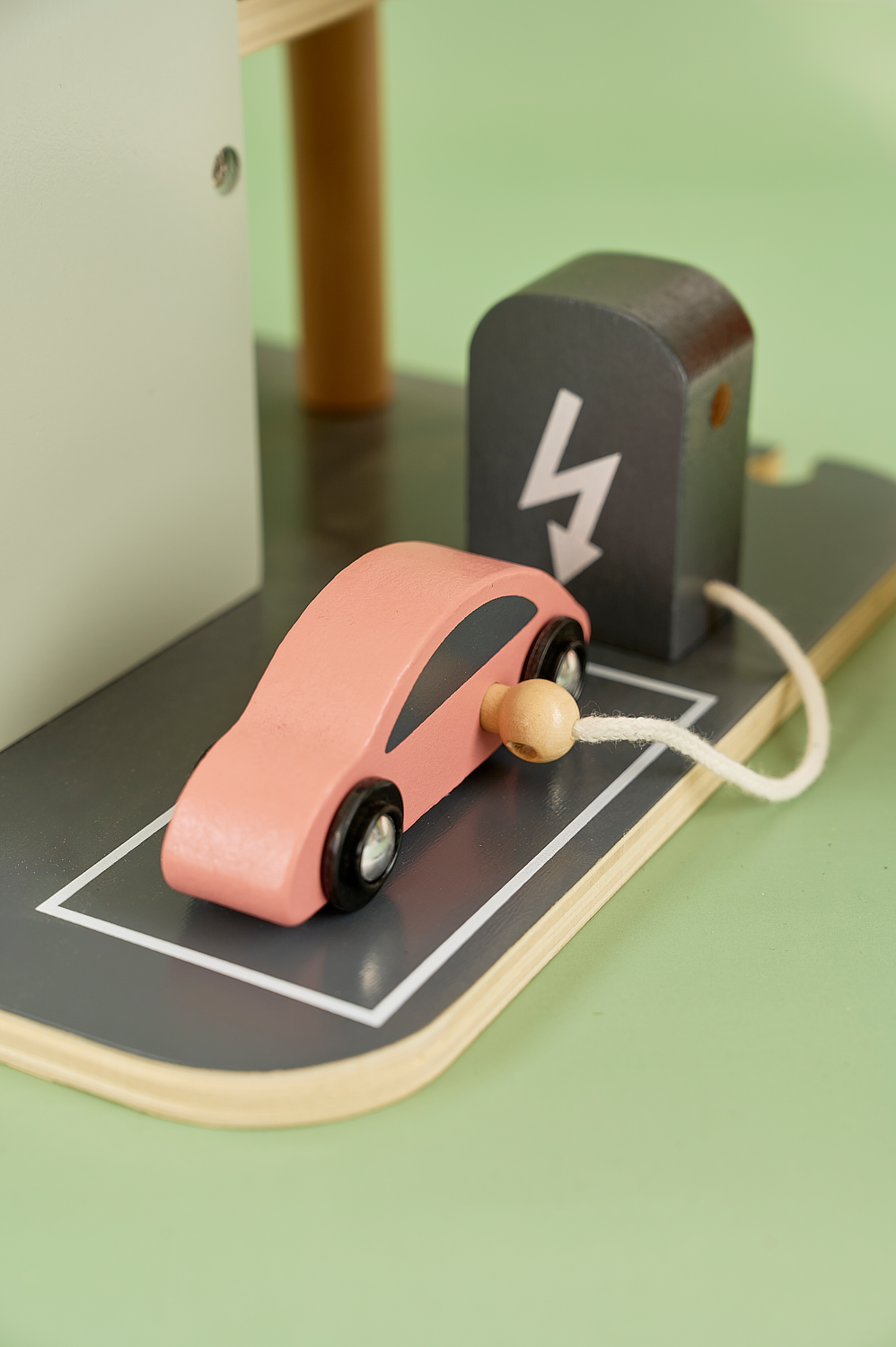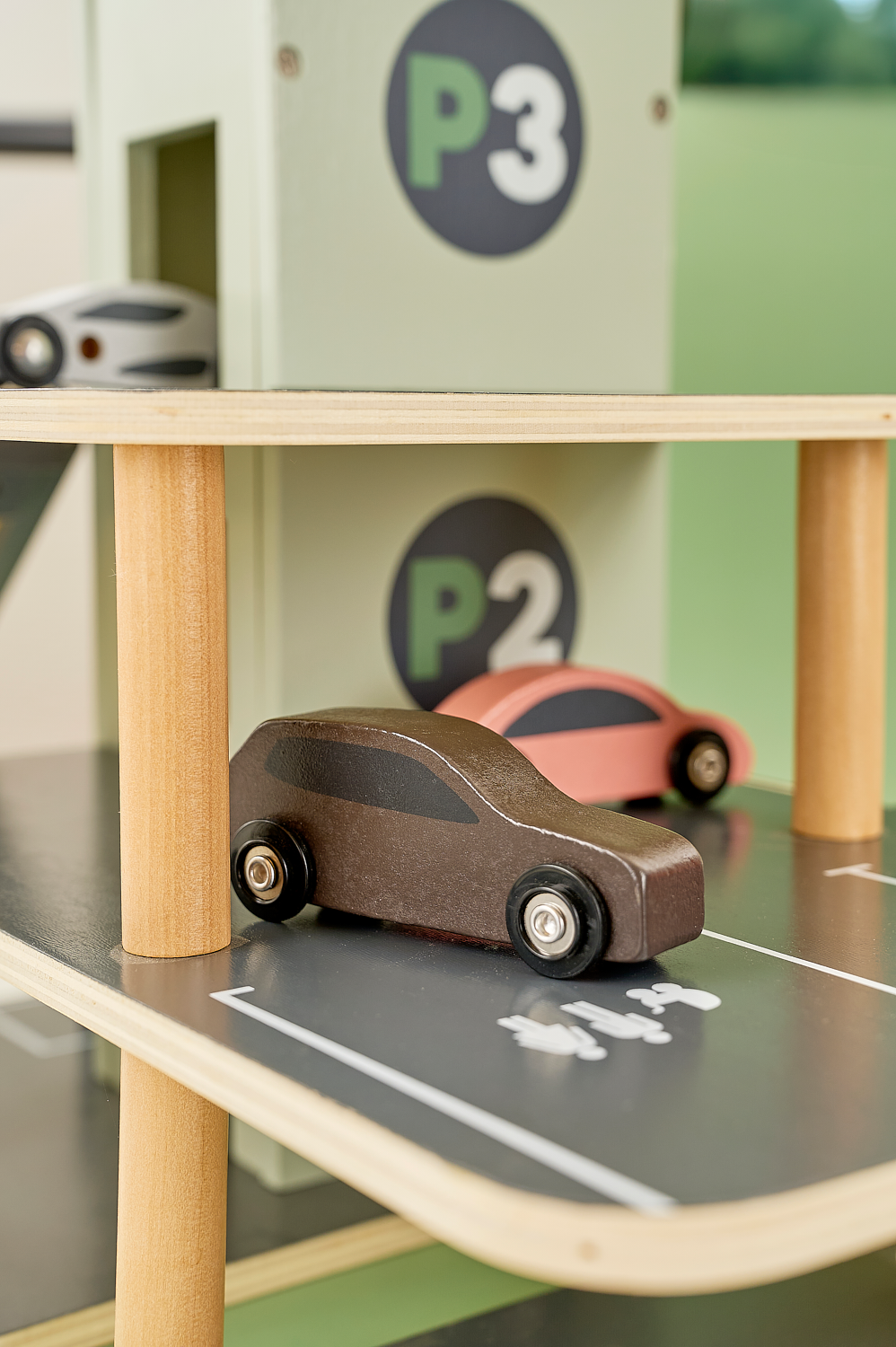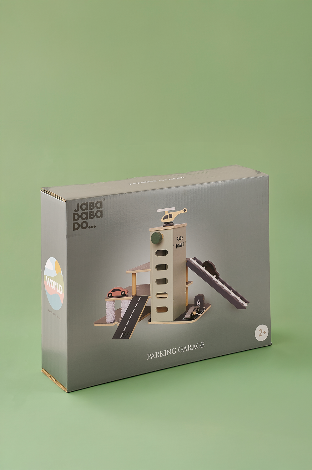 Full gas! Jabadabados coola och fartfyllda parkeringsgarage i trä erbjuder massor av lekmöjligheter för alla bilgalna barn. Tävla mot dina vänner på rampen där två bilar kan köra sida vid sida. Vem vinner? Fortsätt sedan körningen för att tanka eller ladda elbilen och ta hissen upp igen. Om bilarna har blivit smutsiga längs vägen tar du snabbt en tur förbi biltvätten. Starta sedan helikoptern, flyg över staden och landa den på helikopterplattan på garagets tak. Garaget har tre våningar som du kan köra mellan med bilarna. Du parkerar på de tre parkeringsplatserna när det är dags att ta en paus. Hissen styrs med en liten ratt, vilket gör att bilarna kan transporteras till de olika våningarna på ett enkelt och roligt sätt. Med detta kreativa och roliga parkeringsgarage kommer barnen att hålla sig sysselsatta i timmar. Garaget kan byggas ihop med Jabadabado-banor med räls och andra vanliga märken av träräls. Uppmuntrar till kreativ lek och garanterat en uppskattad födelsedagspresent. Innehåller: