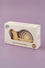 Söt dragsnigel i trä med en stapelbar regnbåge på ryggen. Det perfekta sällskapet när barnet tar sina första utforskande promenader. Regnbågen på snäckans rygg kan lekas med separat eller som en stapelleksak. Varför inte använda regnbågsdelarna för att bygga spännande tunnlar eller broar till din favoritbil? Endast barnets fantasi sätter gränserna. Regnbågen består av fem separata delar. Uppmuntrar till kreativ lek. Tillverkad av FSC™-certifierat trä (FSC™C194598).