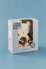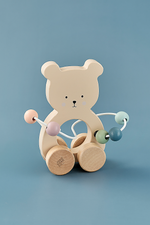 Kördjur i massivt trä, format som en nalle. Med hjul som fötter rullas det lilla djuret enkelt över mattor och var som helst i hemmet. Nallen har också en kulram runt kroppen med 5 kulor i olika färger. En perfekt 1-årspresent.