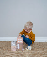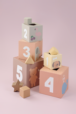 En stimulerande aktivitetsleksak med både staplings- och sorteringsuppgifter. Dessa kuber är både en pedagogisk leksak som utvecklar motorik och hand-öga-koordination och en fin inredningsdetalj. Beröm ditt barn när de sätter in rätt form i rätt kub och lär sig om siffror, eller bygg med kuberna och fnissa när de slår ner dem och börjar om från början. Varje kub har två olika motiv, ett nummer och en form som rätt träbit kan sättas in i. Den största kuben (nummer 5) är 12x12 cm.
