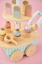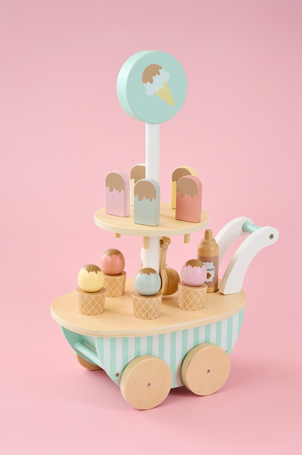 Glass i flera dagar! Vår populära glassvagn är fylld med utsökt glass! Den kommer att hålla barnen sysselsatta i timmar. Glassvagnen består av 10 olika glassar, och det finns både strutglass och pinnglass att välja mellan. Dessutom ingår en god chokladsås och en glassskopa. Vagnen är praktiskt på hjul så att den enkelt kan flyttas runt eller köras runt till alla glasshungriga kunder. Fungerar lika bra stående på ett bord som på golvet. Tillverkad av FSC™-certifierat trä (FSC™C194598).
