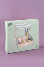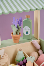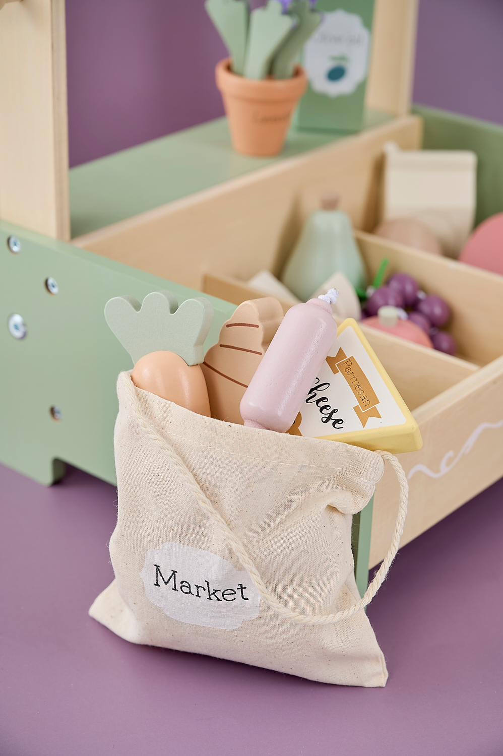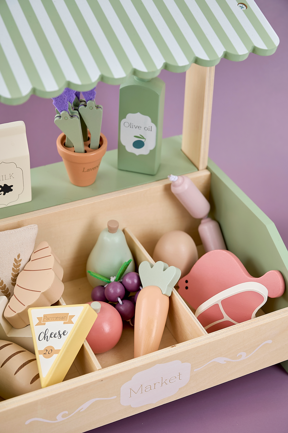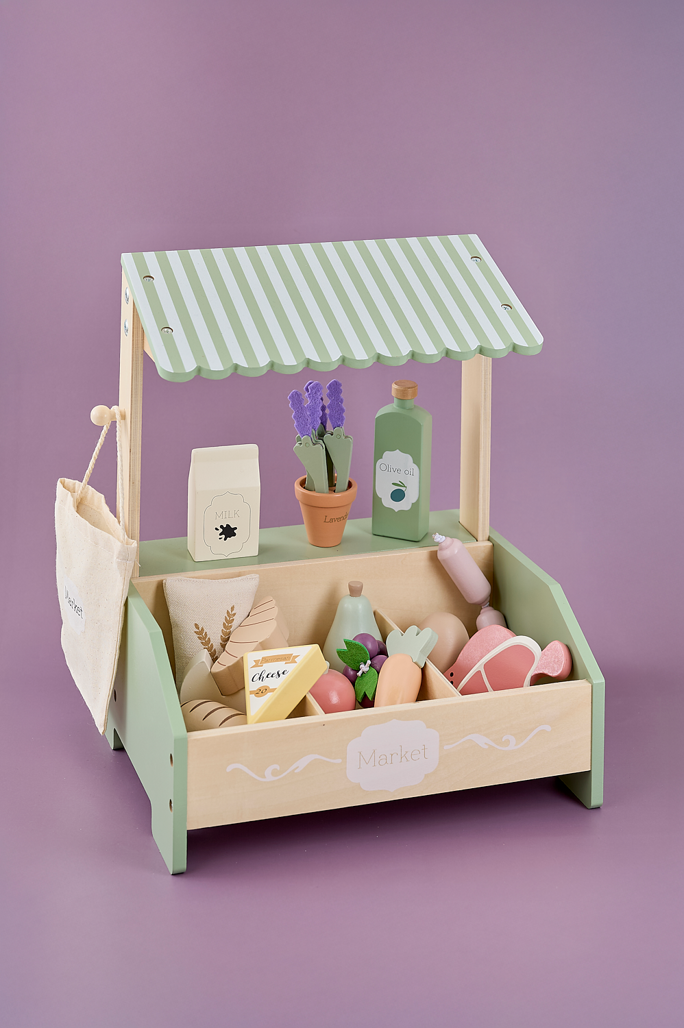 Välkommen till ditt alldeles egna marknadsstånd – allt för små handlare med stora idéer! Detta underbara marknadsstånd i trä är det perfekta tillbehöret för barn som älskar att leka butik och sälja allt från färska grönsaker till hembakat bröd. Setet innehåller en härlig blandning av varor: bröd, grönsaker, kött, ost, mjölk, olivolja och lavendel i en kruka – allt i vackra pastellfärger. Dessutom finns det en liten tygpåse att packa kundernas inköp i. Här kan barn öva på att handla, sälja och prissätta sina varor. Perfekt för fantasilek och för att utveckla sociala och matematiska färdigheter! 1x tygpåse, 1x kruka med lavendel, 1x bröd, 1x mjölkkartong, 1x flaska olivolja, 1x ost, 1x morot, 1x lök, 1x tomat, 1x mjölpåse, 1x ägg, 1x vindruvor, 1x päron, 1x korv, 1x kött, 1x fisk, 1x brieost, 1x croissant.