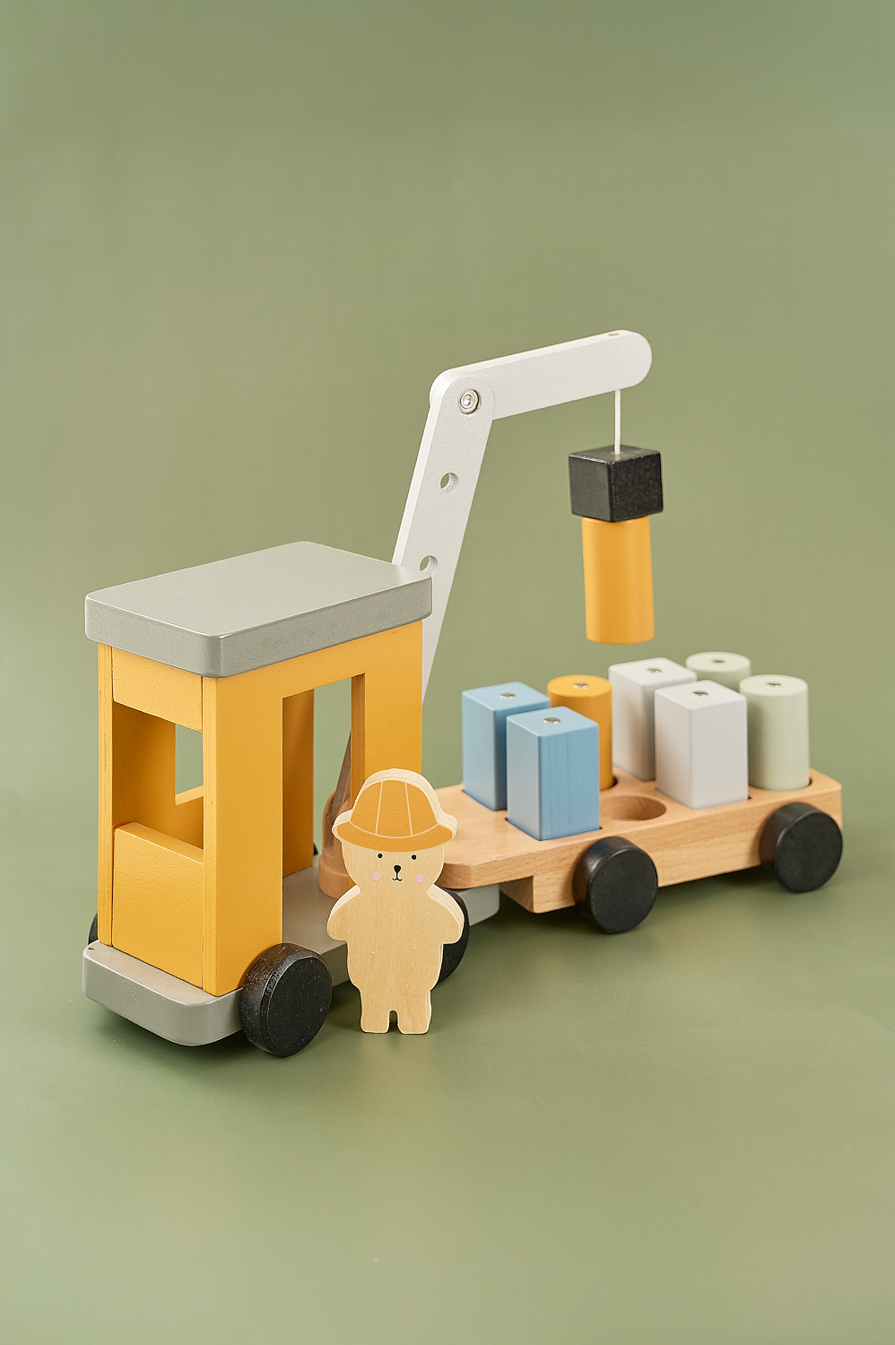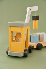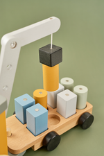 Klassisk kran helt i trä för de lite mindre barnen. Kranen är stabil på 8 hjul för att kunna dra de tunga klossarna och sedan röra sig smidigt. Kranen kan vridas i olika riktningar och även sänkas upp och ner. På den tillhörande släpvagnen finns 8 klossar med magneter så att kranen enkelt kan lyfta upp dem. Kranen körs av den tillhörande föraren. Kranen tränar både motorik och tankeverksamhet i tidig ålder. Innehåller 8 klossar i olika färger.